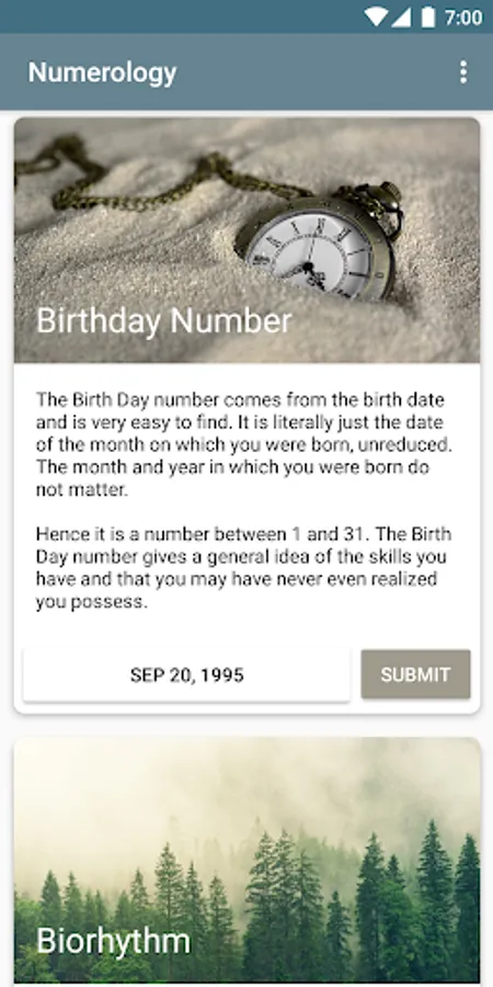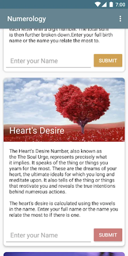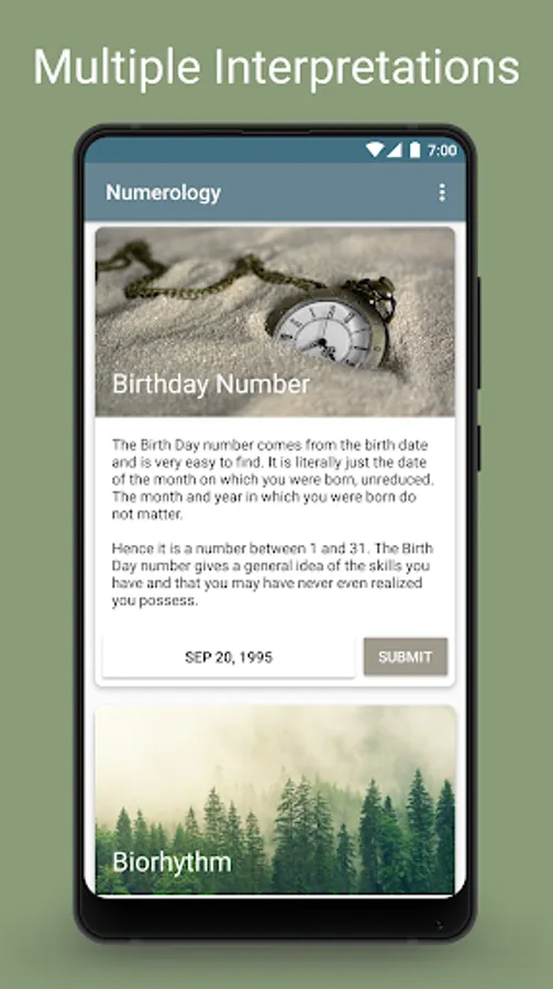This application makes use of the Pythagorean numerology system which is used in western numerology. This system only works with characters from latin alphabet. This numerology calculator takes as input your names and date of birth. You will get a free numerology report for each number of the numerology system to understand their meaning. All the numerology reports are written in english and free. They will help you get the most of your year 2019.