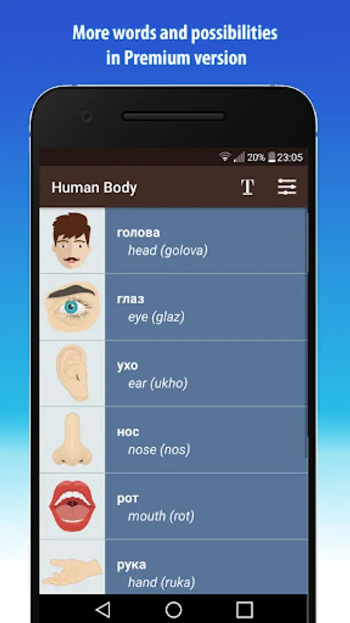- After tapping on each word, or phrases there is an actual pronunciation sound of this word/s in Russian.