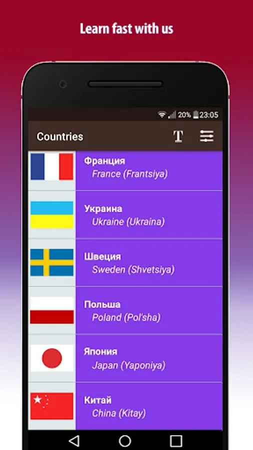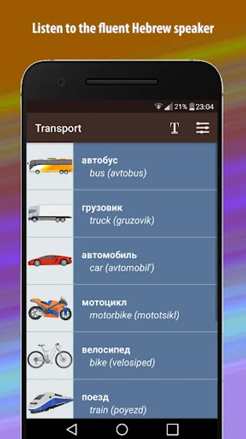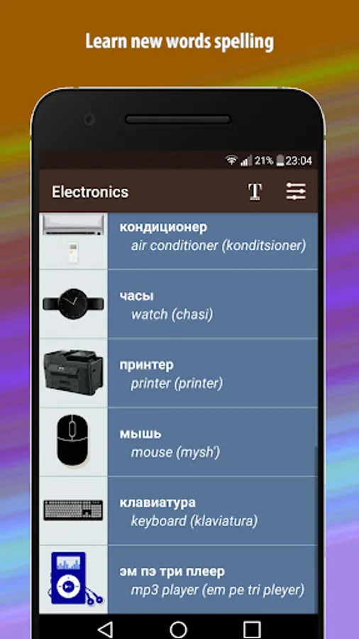 - App contains translation from Russian to English, English transcription, and word in Russian itself.