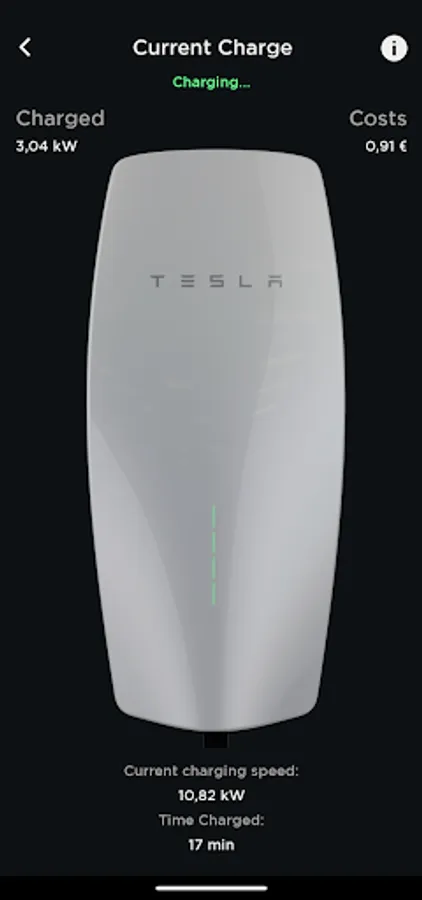 The app features a user-friendly interface based on the original tesla UI that displays important metrics such as charging speed and costs.