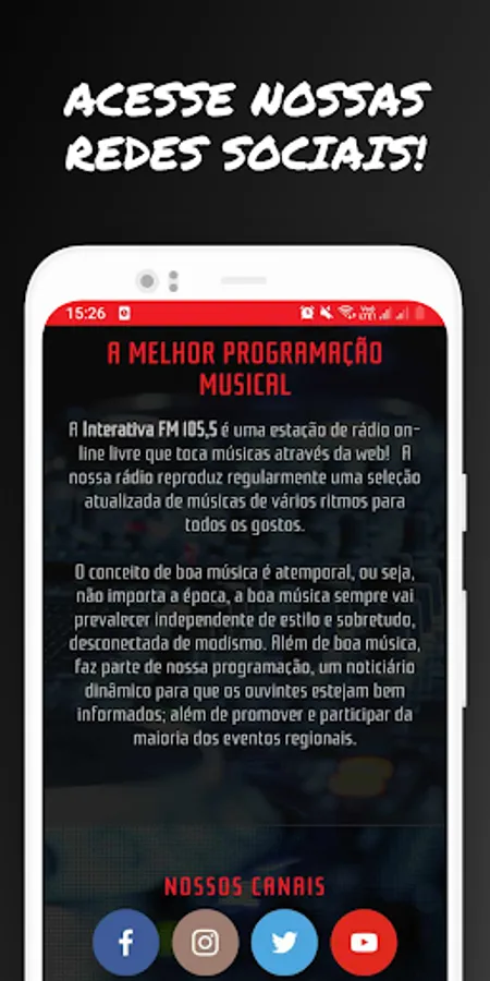 Now you can also listen to our Radio on your cell phone or Tablet with Android system, click on the PlayStore icon on your smartphone and look for the "Interativa FM 105.5" application, install and listen to our Radio anywhere. Enjoy this new option, and listen to us directly from your Tablet or Smartphone.