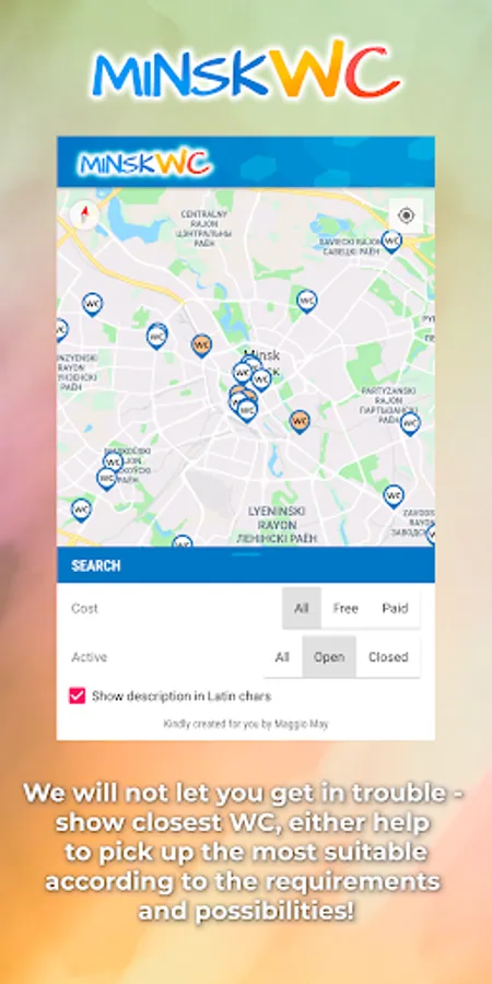 - extensive database of toilets in Minsk, incl. paid, free, open and closed