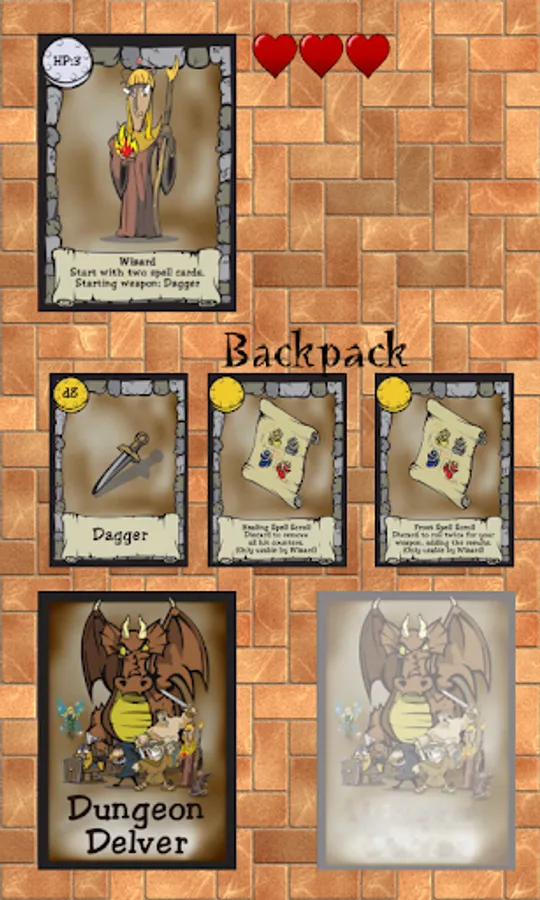 Dungeon Delver is a single player, card and dice game . The goal of the game is to make it through the entire dungeon, battling monsters and survivingany traps you may encounter. There are many dangers, but don’t lose heart, because there are also useful treasures to be found along the way as well. You play as one of six heroes, each with unique abilities and each with high hopes that they will be the adventurer to complete the quest.