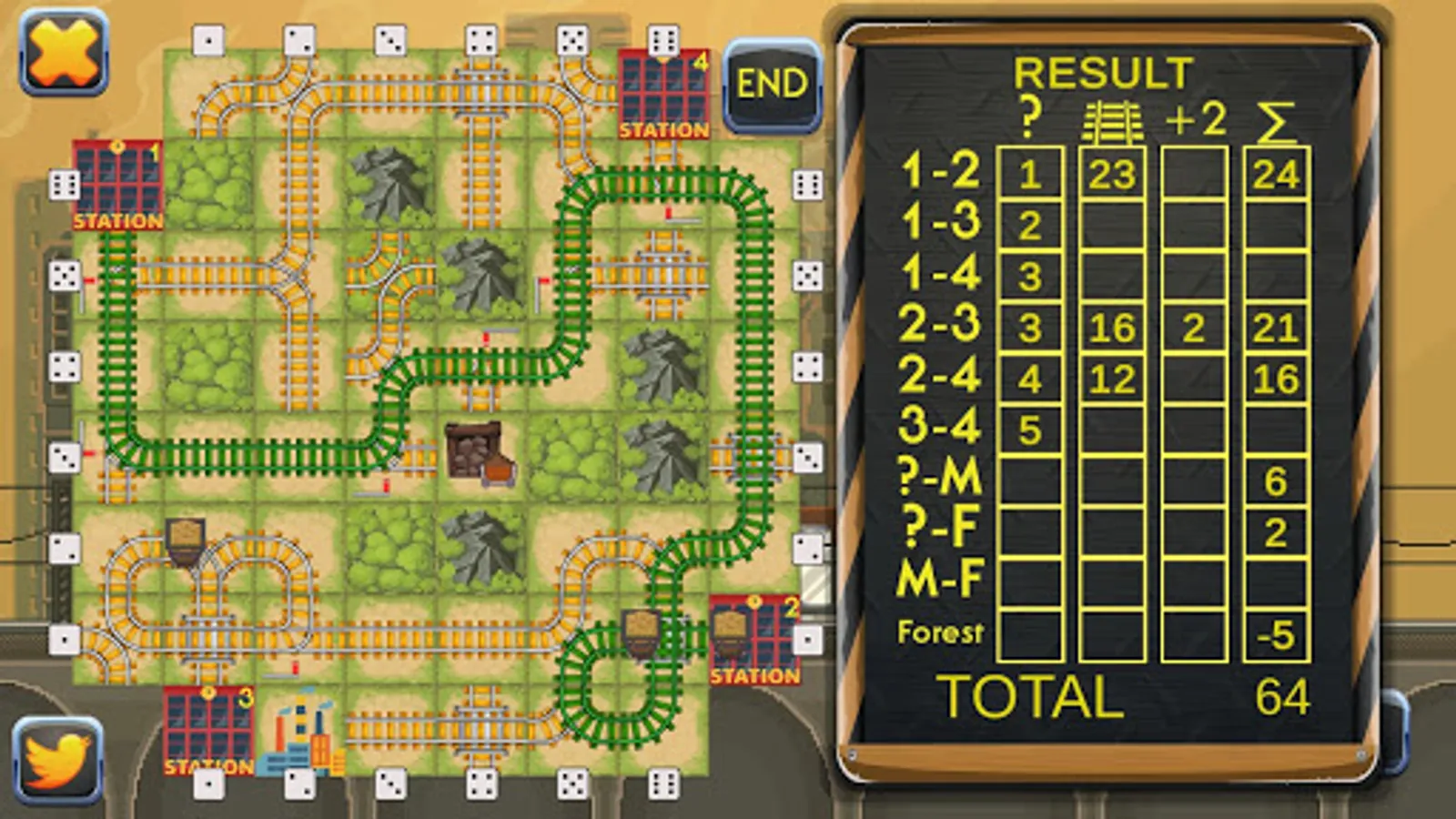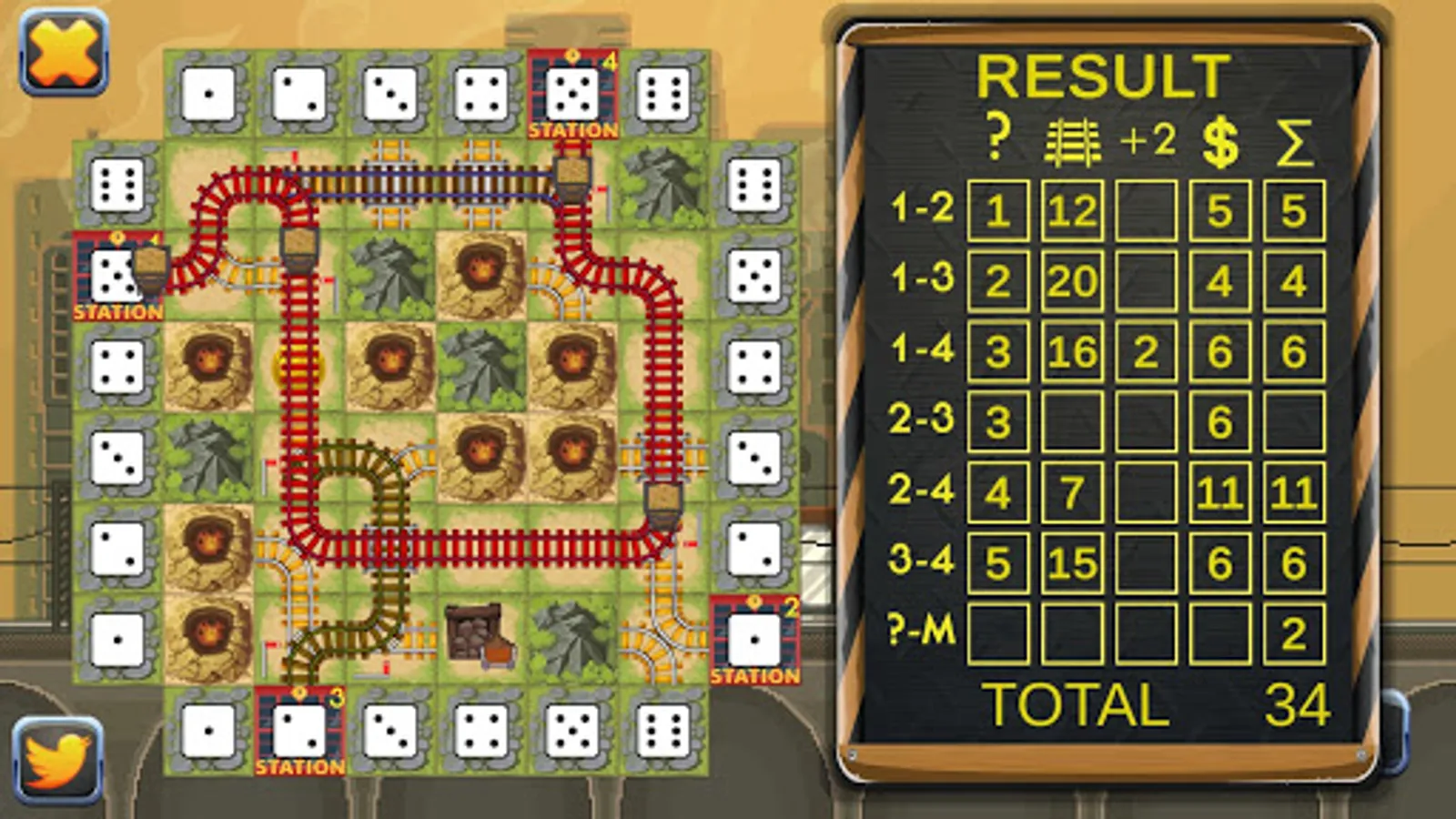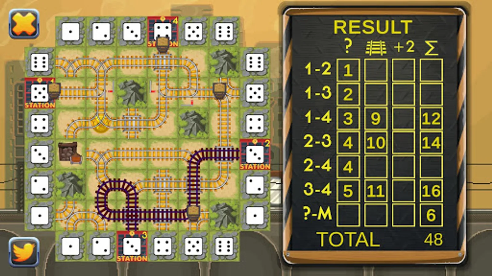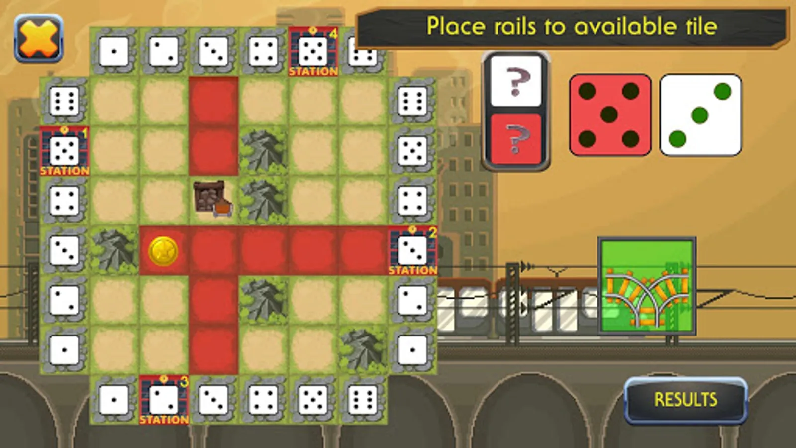 The idea of this board game is pretty simple. You have the field on your screen, which can remind you of a solitaire game, but here is the difference: instead of bombs, there are 5 mountains that you will randomly lay on your board. Every time you roll the dice and get a piece of the puzzle, certain tiles on your screen change colors to dark red to show you where to build the part of the road this time. You will have plenty of railroad crossings and the main task is to create long chains that will connect train stations on the different sides of the board with a mine. Everything will be drawn automatically, unlike it is done when you play a pencil and paper game. All you have to do is, using the tip of your finger, place the parts of the blocks to the right area due to your own strategy. All railroad stations have to be connected with each other and each of them must have an extra route to the coal mine. You’d better remember that each station has its own value and the longer the track the more points you will get.