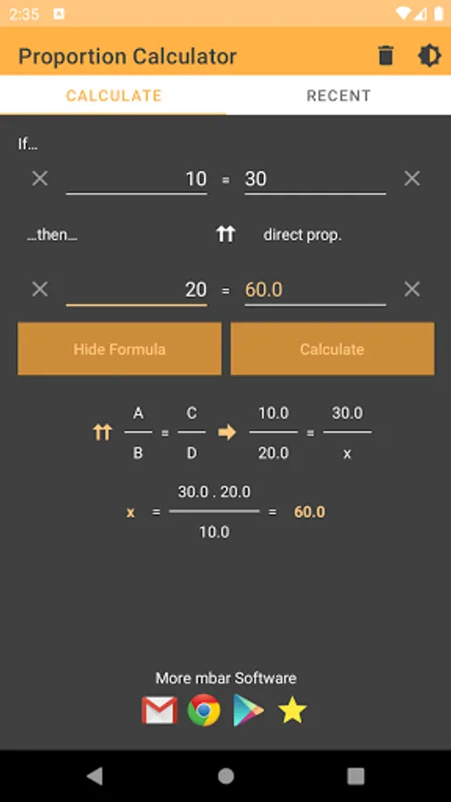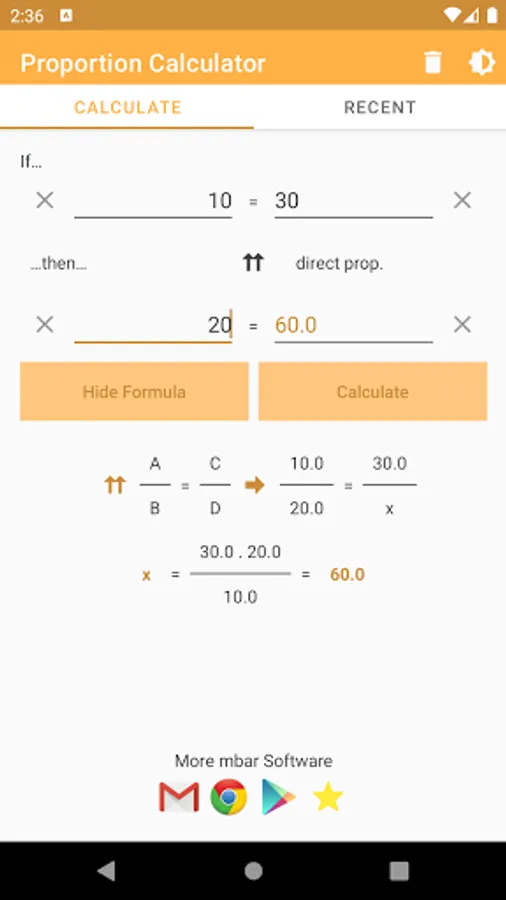 This App calculates proportions (direct or indirect), also known as "rule of three" by entering three known values and hitting "Calculate". The App will calculate the missing value for you!