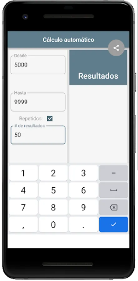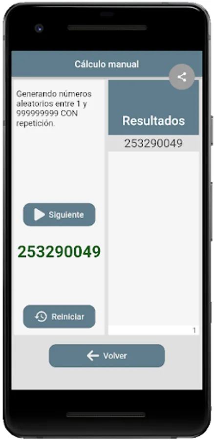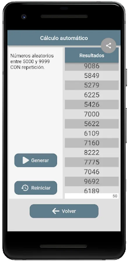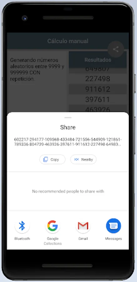 ✅ The generated numbers are stored in the list on the right side of the screen. It can be shared by email, message, etc. And it can be copied to paste the results in a different application (like excel for example)