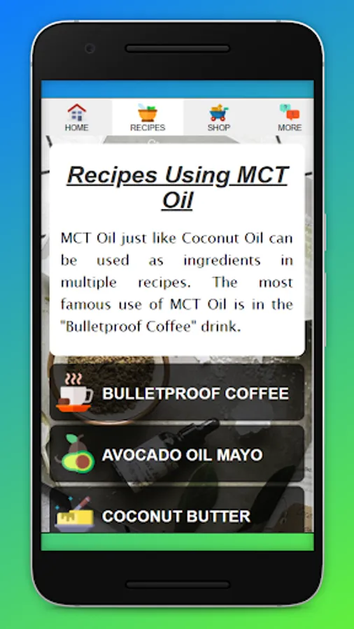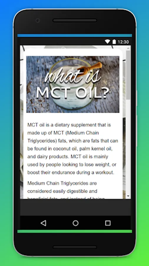 The MCT Oil Benefits, Uses and Recipe App contains a collection of useful info ranging from how its made to infographic of MCT Oil VS Coconut Oil. The app also has some famous healthy recipes made using simple everyday ingredients with the oil.