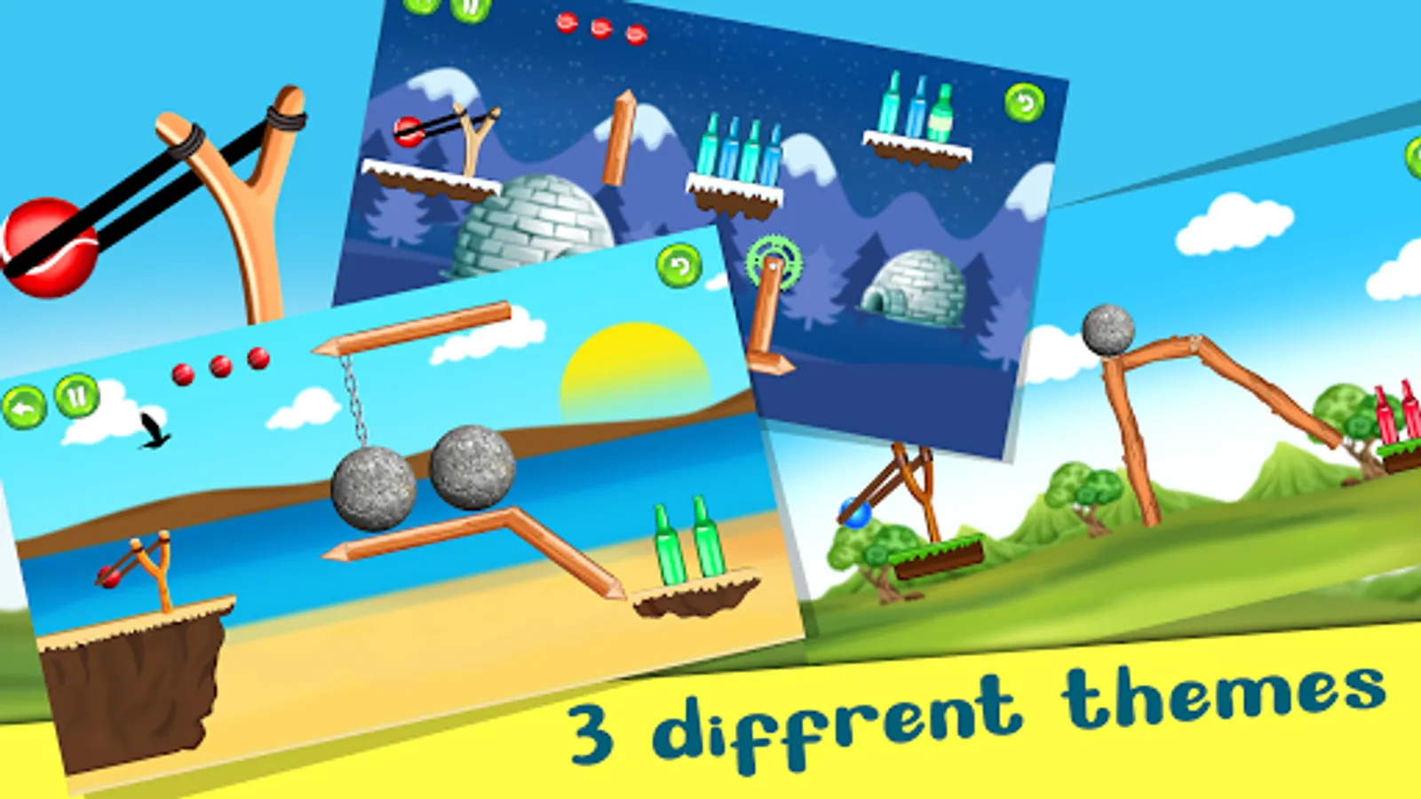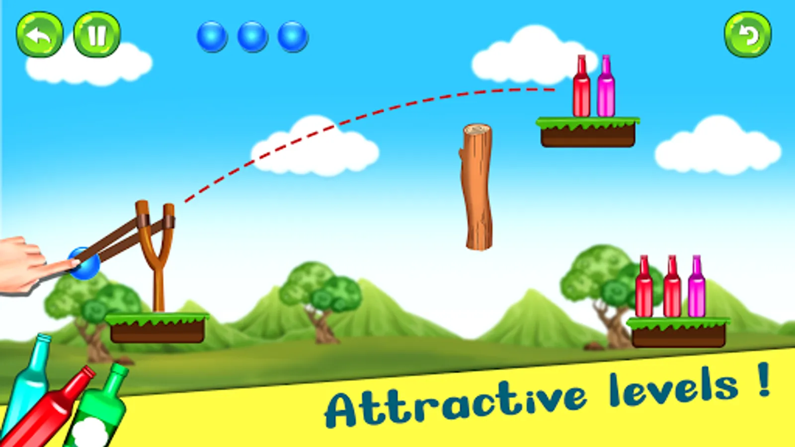 In every level of the game, the bottles will be arranged in a different challenging manner and within the time limit you have to hit and break all the bottles by shooting balls on it using a slingshot, and you will get a limited number of balls for it.