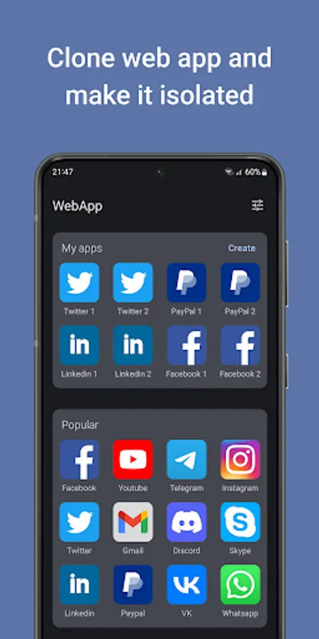β With our web widget and mini internet browser, you can create as many sesame shortcut lite apps as you want β it's completely free and unlimited! You can even clone app by creating multiple account of the same website widget, and our dual app will automatically rename them.