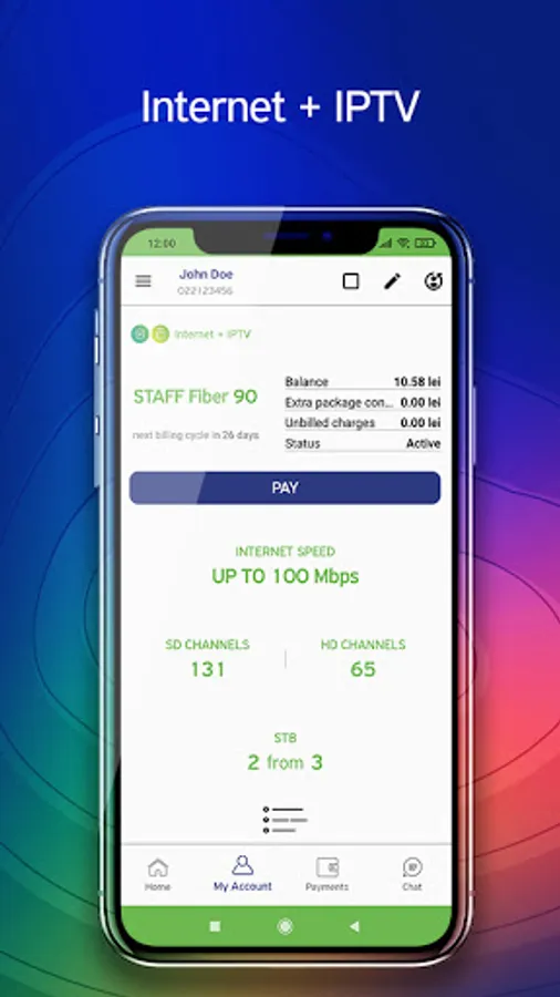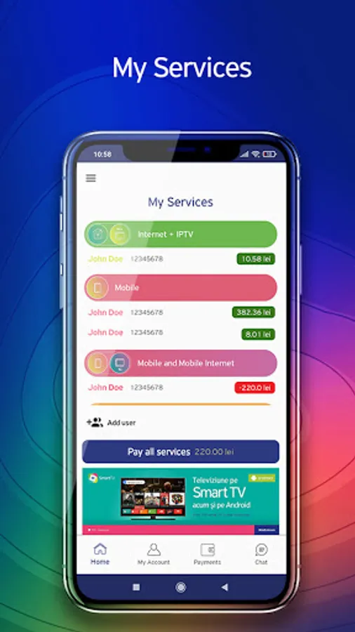 Application MyMoldtelecom is an ideal solution for managing Moldtelecom services from your smartphone or tablet. In MyMoldtelecom, it is necessary to add a separate user account for EVERY service: Prepay and Abonament, Internet and / or IPTV, Fixed Telephony, Multiscreen and MTalk Prepay.