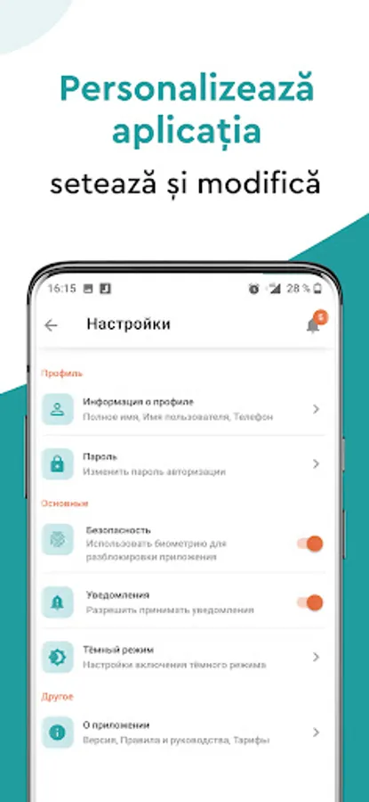 Te poți 🎯 autentifica în aplicație, folosind același login și parolă ca și în cazul Internet Banking-ului. Ulterior, te autentifici cu ajutorul biometriei, Face ID sau Touch ID.