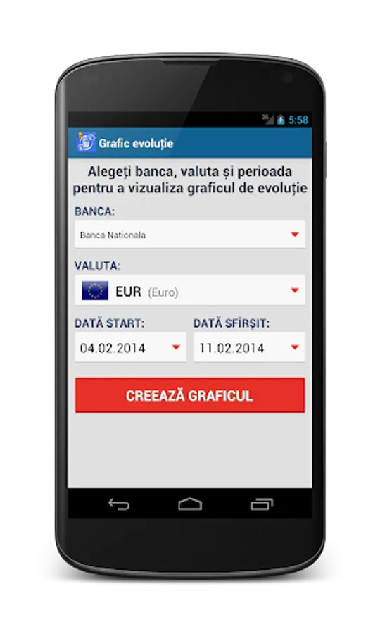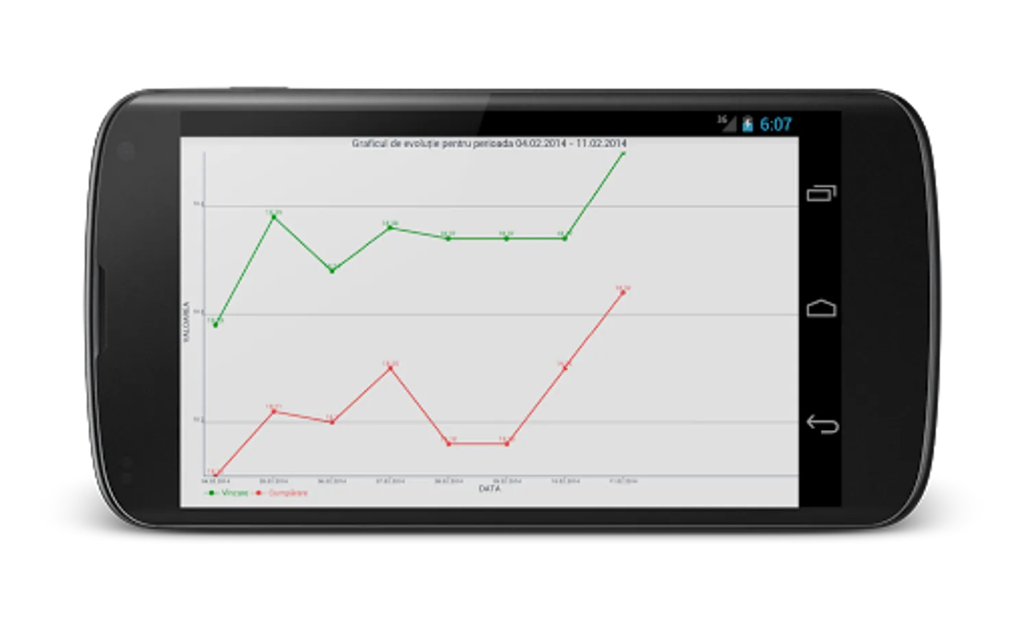The application allows you to view graphs of evolution currencies. Functionality can be accessed via Menu / Chart evolution. Choose bank, currency, then type in the creating graphics. The user can choose a maximum of 30 days for displaying the graph.