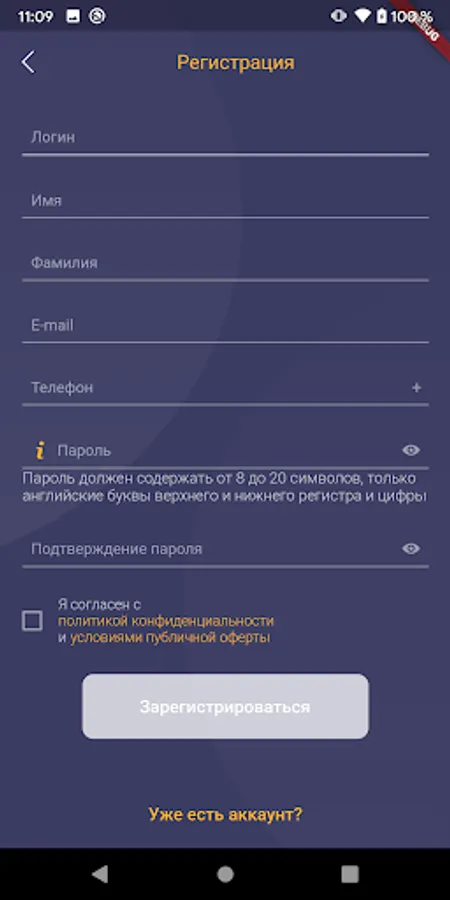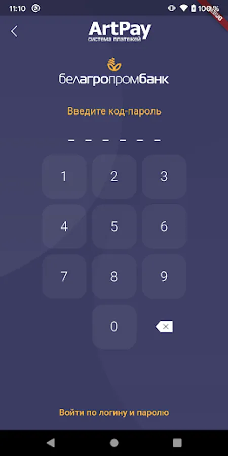 When you first download the application, a mobile phone number will be requested. To confirm registration, an SMS message with a code will be sent to this number. In the application window, enter the received code and click the "Continue" button. You can change the password to access the application in your account. It is available by clicking on the icon in the upper right corner of the application window displayed after a registered user enters the application.