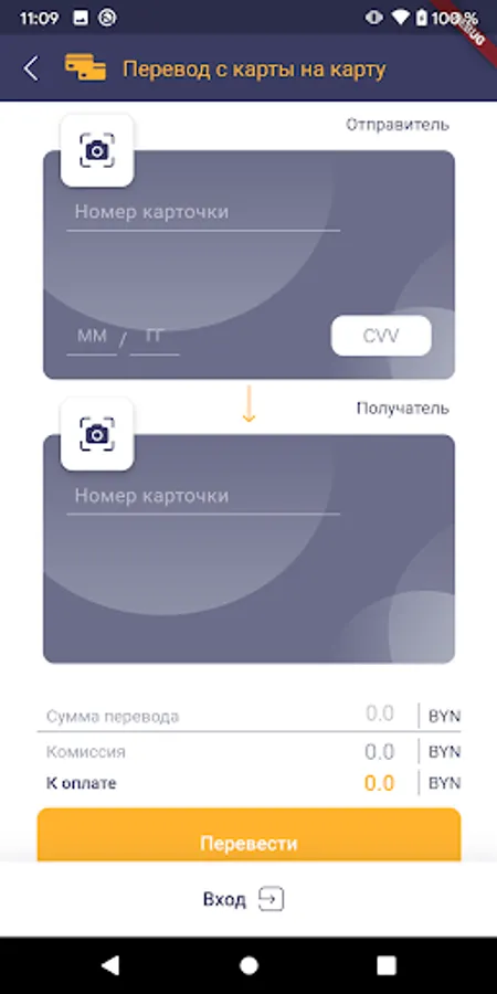 Transfer funds from card to card is available without registration. Registration in the BULBA mobile application is free and is not required. Registered users get the opportunity to bind their cards, access to the translation history.