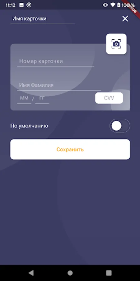 You can add bank cards to the application. To do this, select the map icon and click the “+” icon. The card number can be entered manually or by scanning the phone’s camera. The card can be assigned the status "Default".