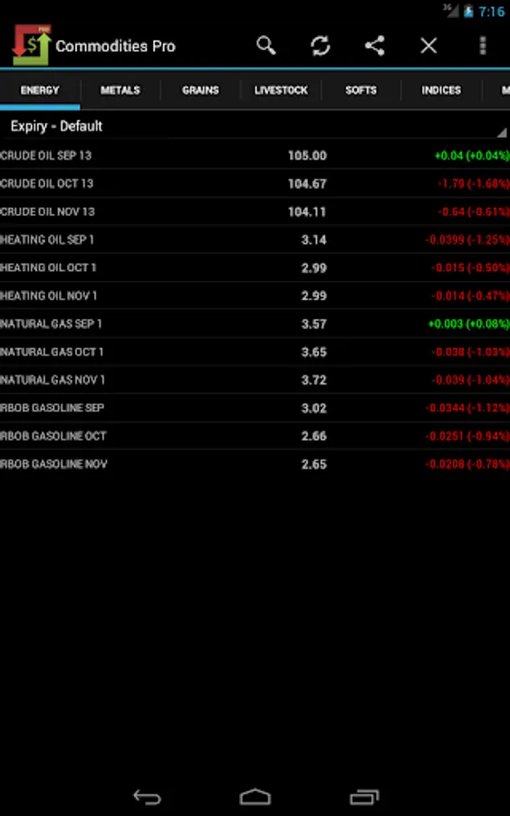 * Different commodities are displayed in separate sections like Energy, Grain, Metals, Softs, Livestocks, Indices