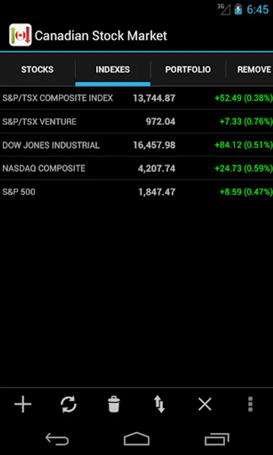 * Quotes for stocks and indexes are displayed in separate tabs.
