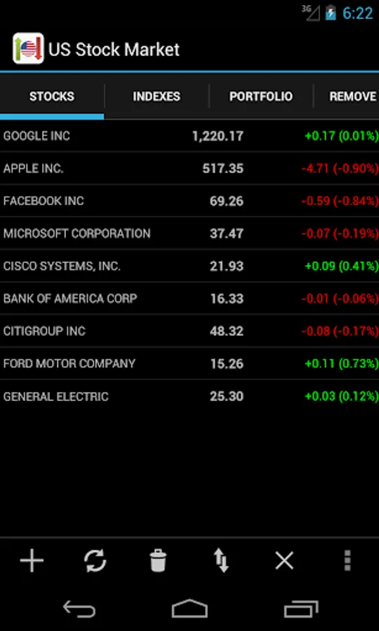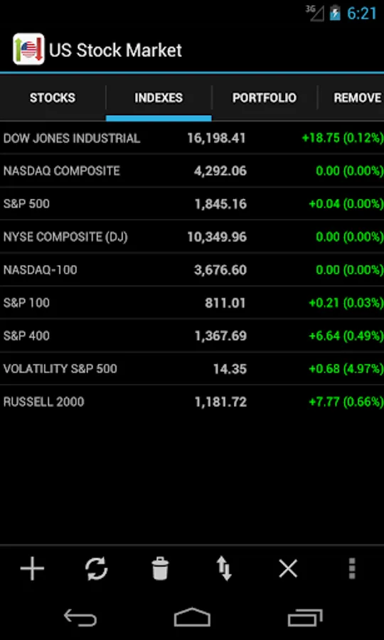 * Quotes for stocks and indexes are displayed in separate tabs.