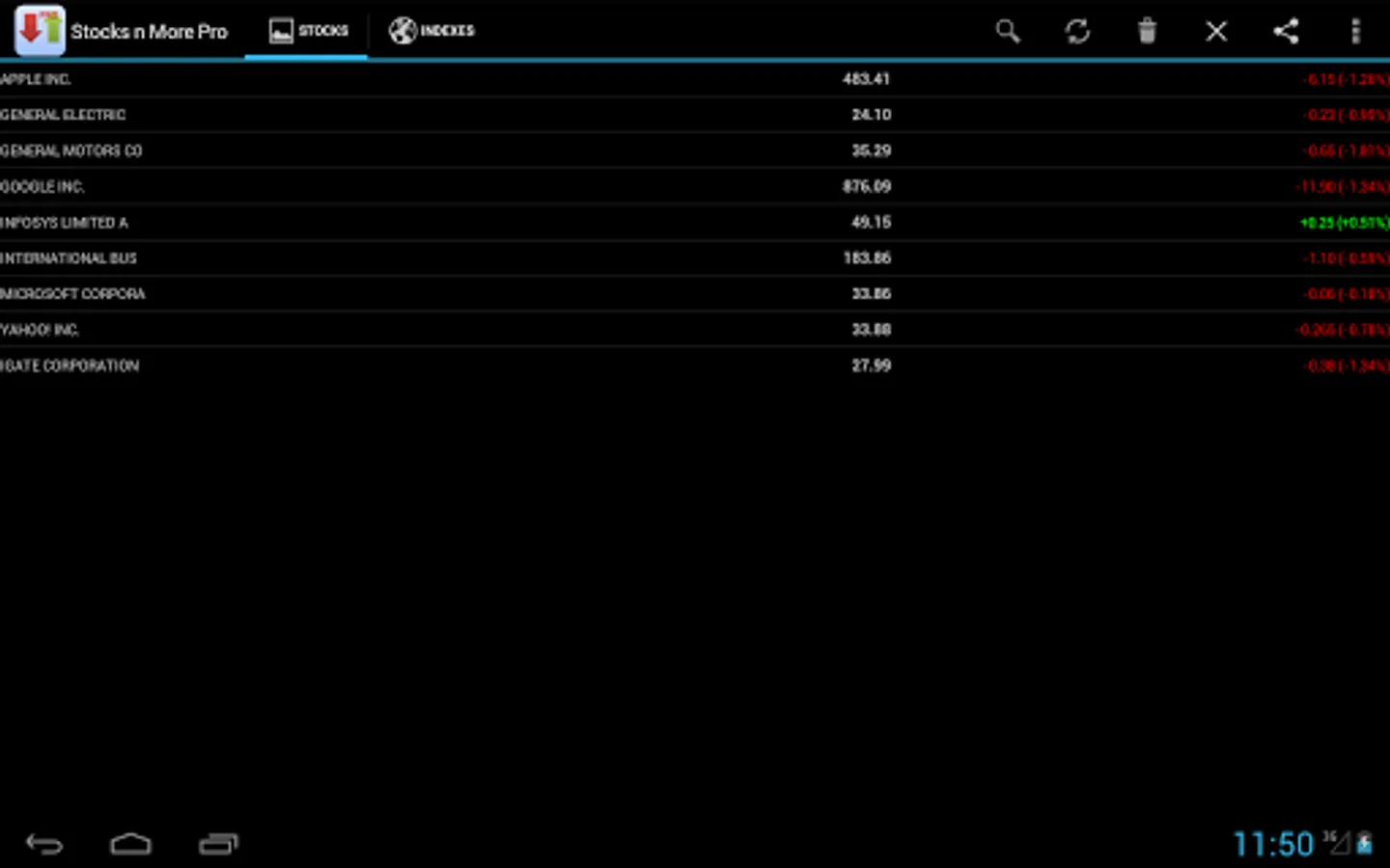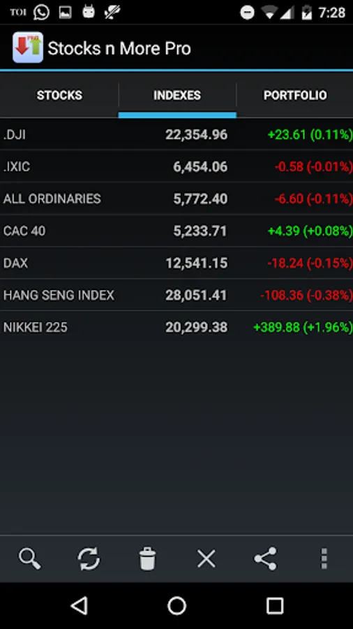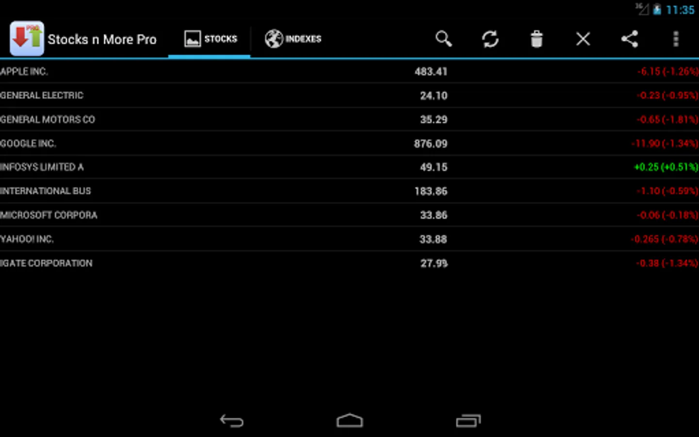 * Quotes for Stocks and Indexes are displayed in separate tabs.