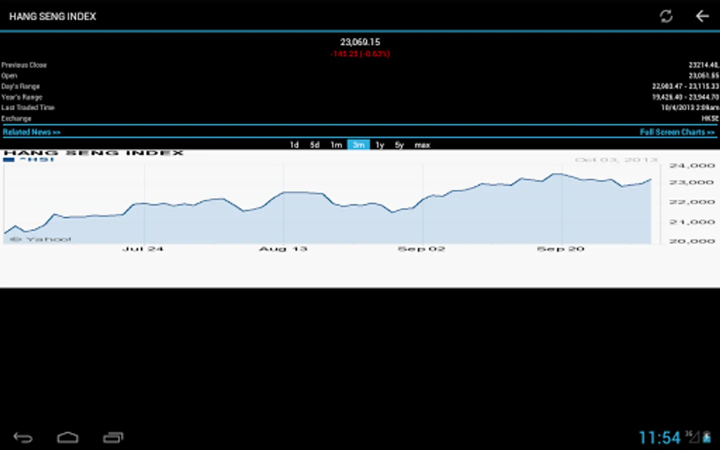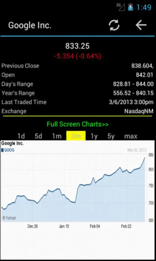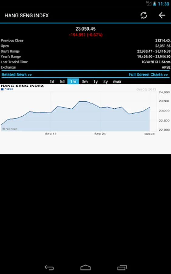 * Full stock/index details with open, close and price ranges are displayed with charts.