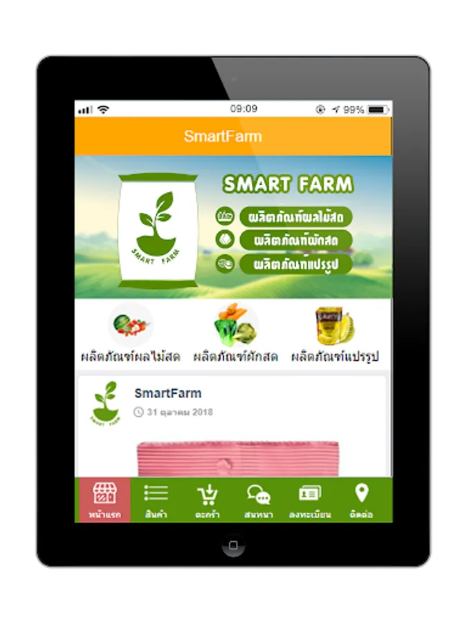 SmartFarm is an application that collects a wide variety of agricultural products. Fresh vegetables, fresh fruits and processed products. For users to buy products directly from farmers. Both large and small are included in the SmartFarm application.