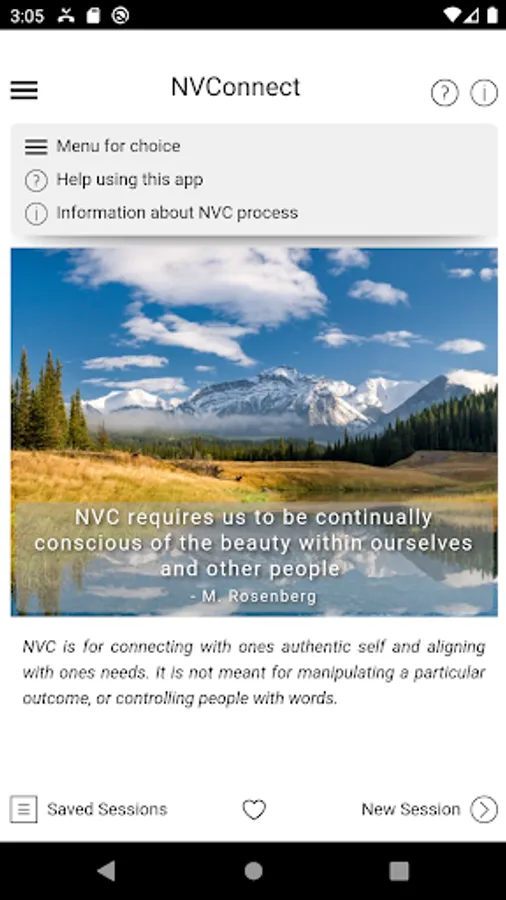 NVConnect is a high-value mobile app developed to provide Nonviolent Communication (NVC) support at your fingertips. It supports and provides ways to practice, integrate, and deepen NVC principles – growing your capacities to shift from reaction to authentic empowered response and empathy. This comprehensive and easily interactive App also offers great diversity for engaging with your NVC practice: offering choices for starting from where you want to start (starting were you are at/with what is ‘alive’ for you) as well as options to Export your process or practice sessions and expand on them, reflect on them, journal them... beyond the App!
