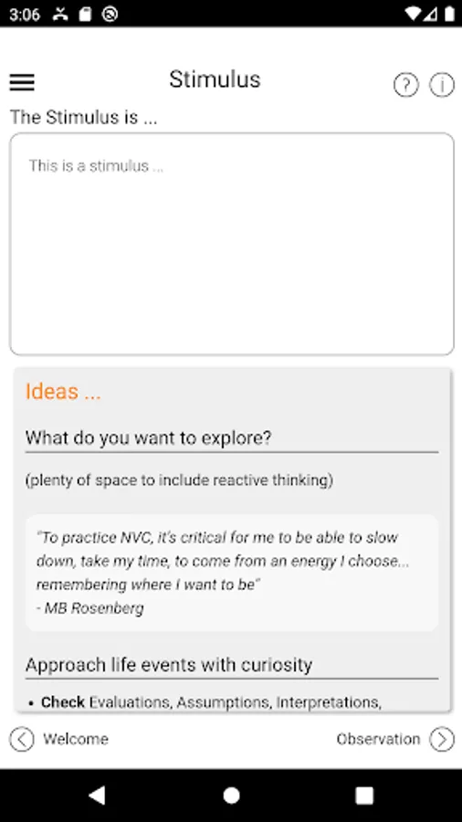This App is not intended to "teach" NVC, but rather to support your practices and processes by providing a large range of easily accessed instant support. It includes the components of NVC (Observation, Feelings, Needs, Requests) and additional components of Intention, Stimulus, and Choice – all with extensive guidance.