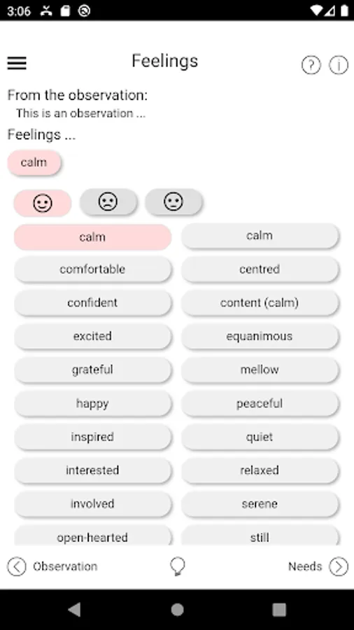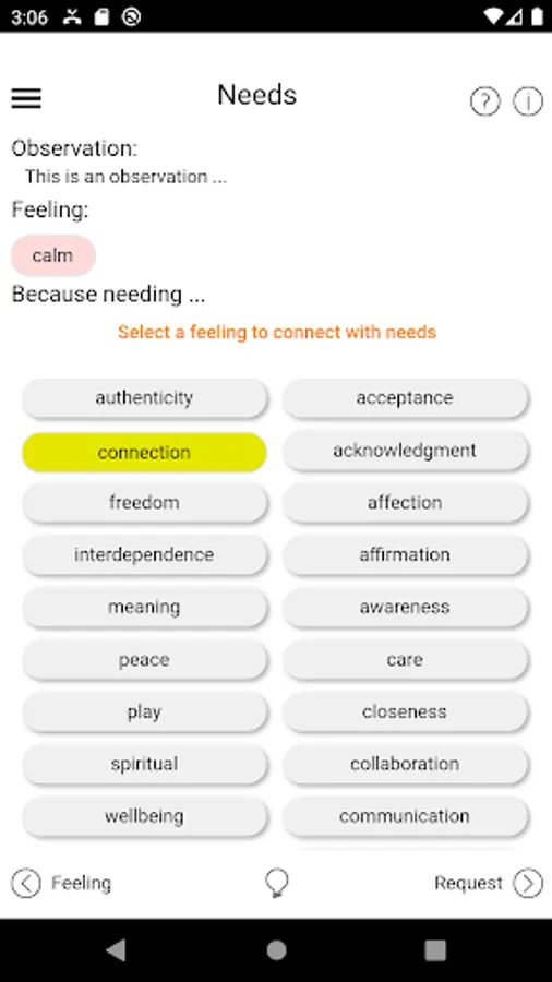 NVConnect offers an extensive help section, reminders, and suggestions for each component - including a gift of Invitations for Intentions (to deepen your NVC practice) created by Filipa, especially for this App. In addition, there are expanded feelings and needs lists, a faux feelings list, and many inspirational quotes offered throughout – Huge Value!