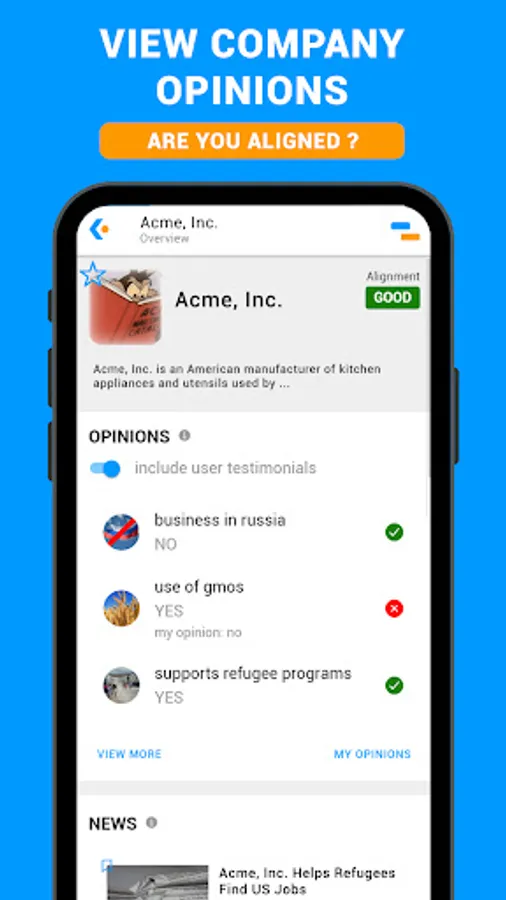 Companies know you well. They track your daily digital life, your habits, your opinions. With Alygne, discover companies' opinions on a variety of topics like abortion, deforestation, plastic use, … Search for companies in Alygne to get an instant alignment score and testimonials from other people.