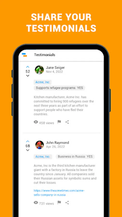 - Interact with other users by voting on testimonials that have been helpful for you.