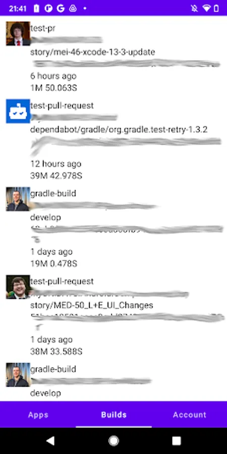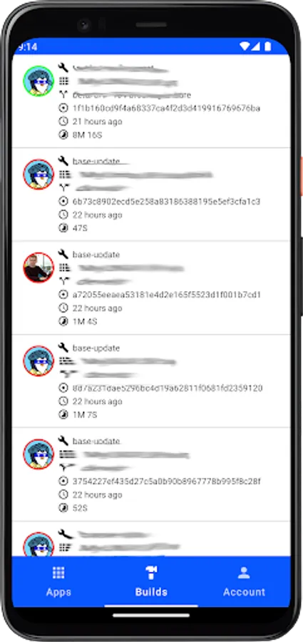 Upon launching this unofficial app, users are presented with a dashboard that shows a list of their current builds, including their status, progress, and any associated metadata such as the commit ID or branch name.