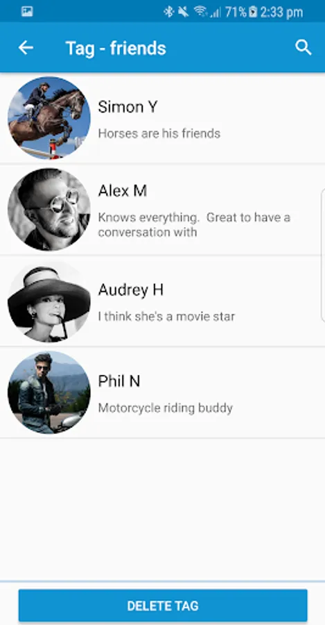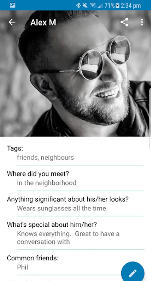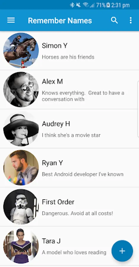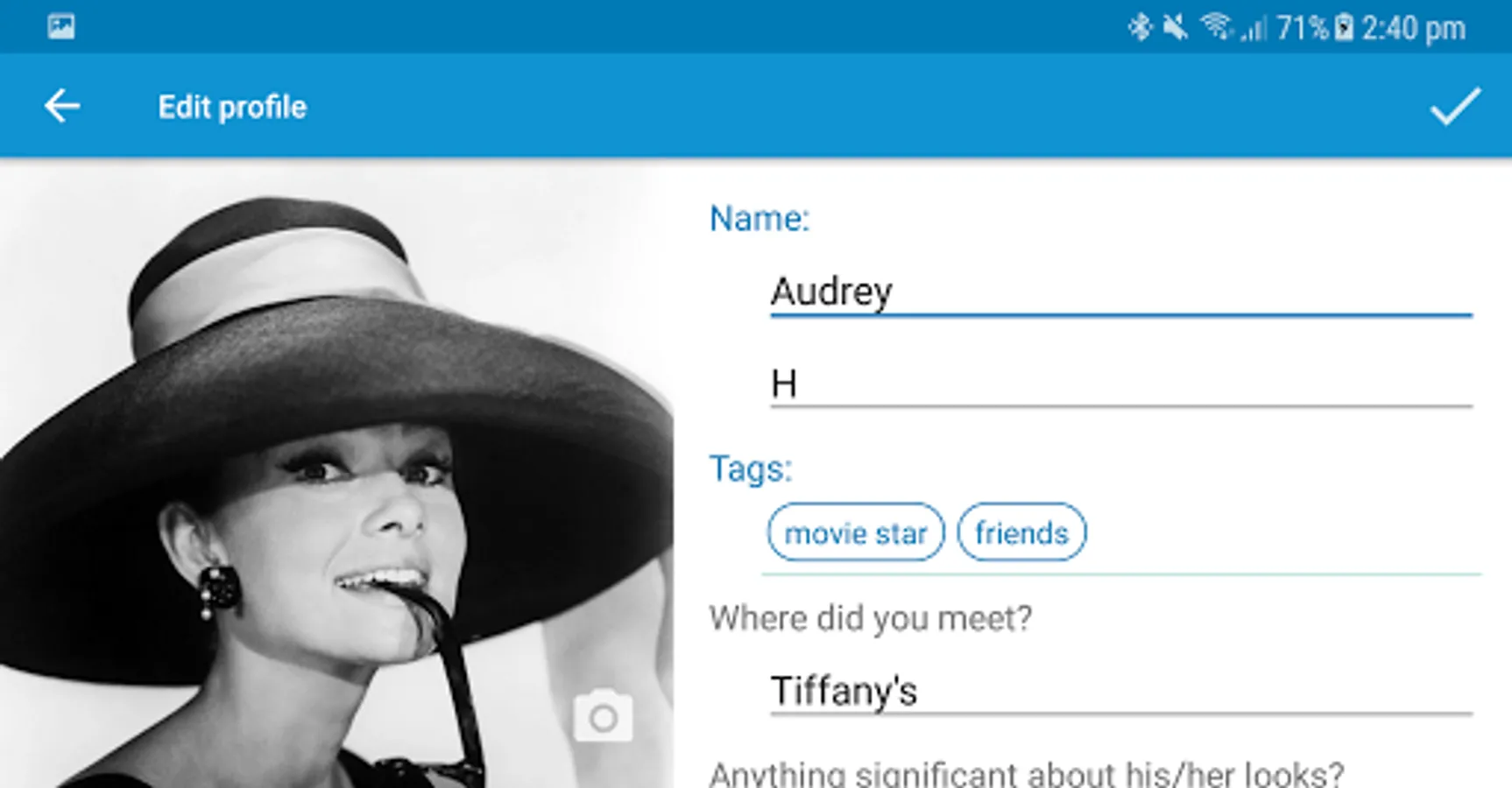 No more embarrassment like this in the future! Download this app now and create a profile for a person you just met, add a photo and write something about him/her that will help you remember their names. Next time you see someone that you met only once, call out his/her name. People will be impressed. They will think you have concern for them and made the effort remembering their names. Thanks to this app, you know you didn't put in too much effort. End result? More friends!