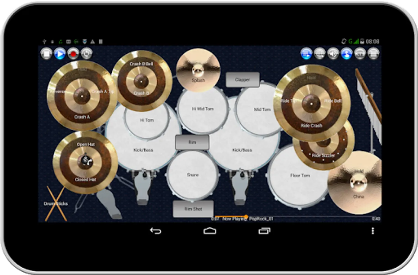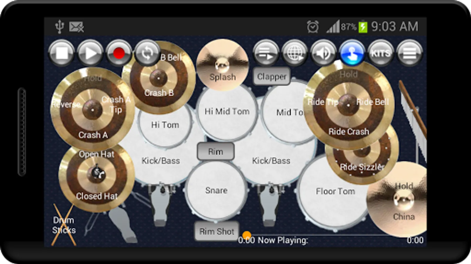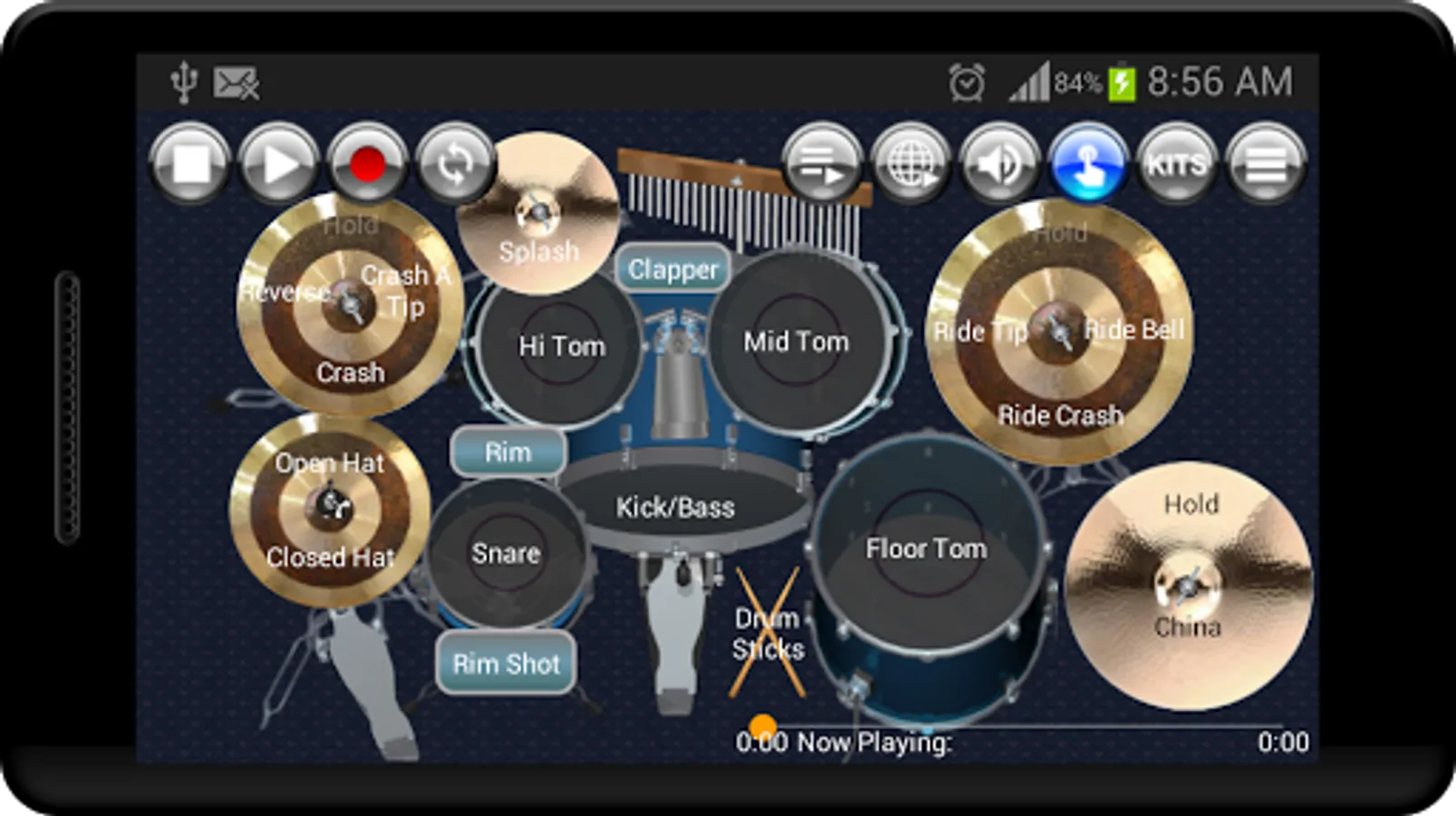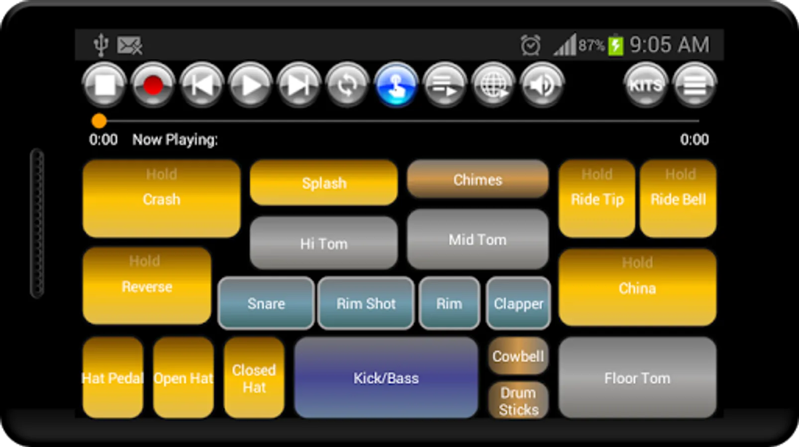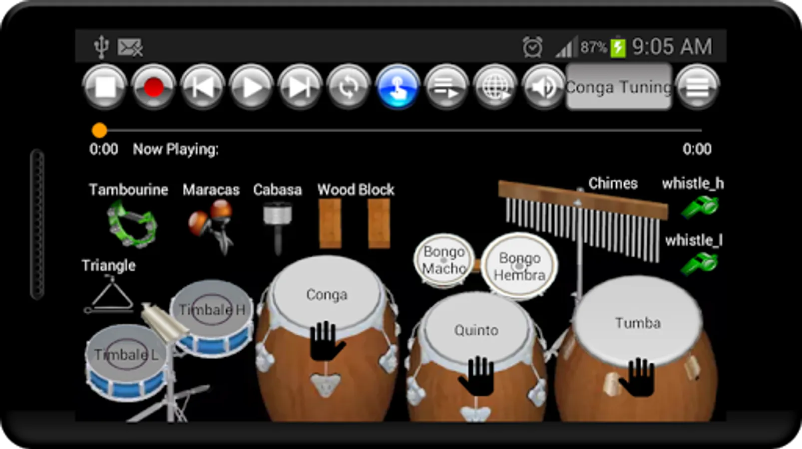 Drums, Percussion and Timpani Pro is the ad free, paid app package of Drums, Percussion and Timpani free app with ads. It is a low latency all in one bundled app for playing drums, percussion set, timpani, audio player/looper, and audio recorder. There are eight layout options for playing drums consisting of three 5 piece kits, two 6 piece kits, one 7 piece kit, one eight piece kit, and a drum pads interface. Drum sounds featured are sounds for standard kit, studio kit, power kit, electronic kit, hit kit, jazz kit, analog kit, and brush kit. The percussion set consists of conga, quinto, tumba, bongo, timbales, cowbell, chimes, woodblock, triangle, whistle, maracas, cabasa, and tambourine. The app features American and German timpani layouts. The app's audio player can access and play user's music collection in their device's music folder.