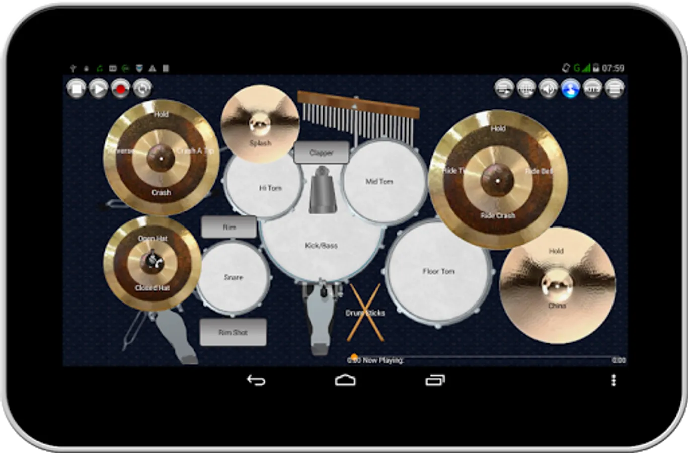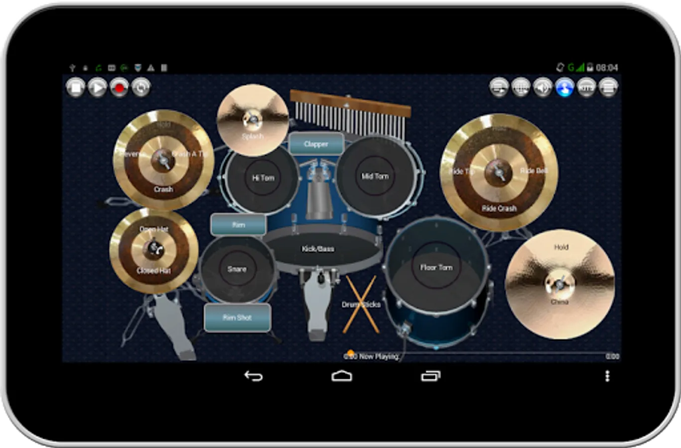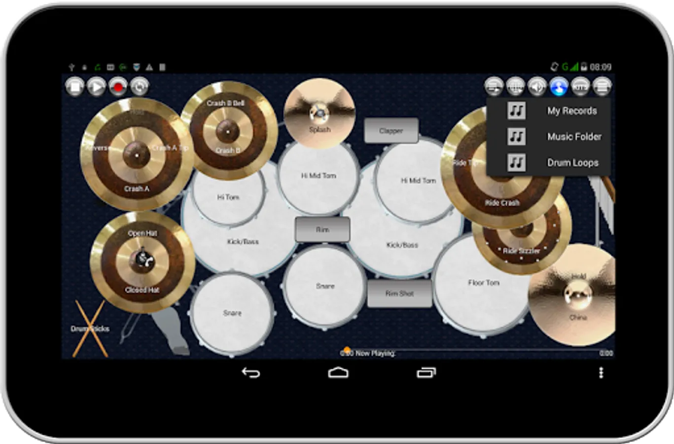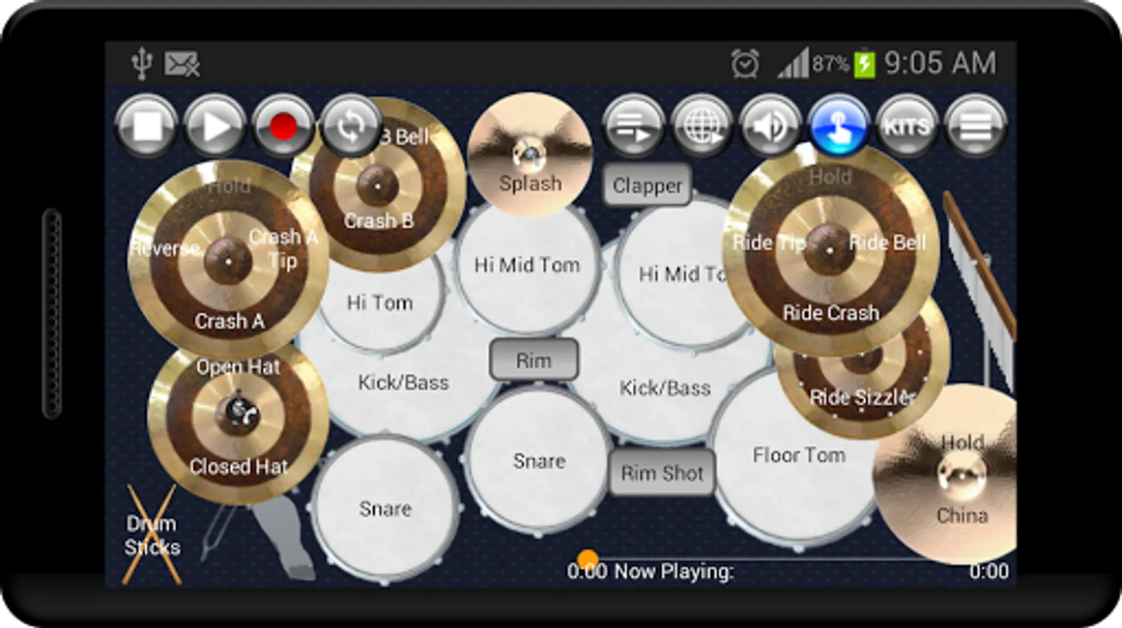Drums, Percussion and Timpani Pro is the ad free, paid app package of Drums, Percussion and Timpani free app with ads. It is a low latency all in one bundled app for playing drums, percussion set, timpani, audio player/looper, and audio recorder. There are eight layout options for playing drums consisting of three 5 piece kits, two 6 piece kits, one 7 piece kit, one eight piece kit, and a drum pads interface. Drum sounds featured are sounds for standard kit, studio kit, power kit, electronic kit, hit kit, jazz kit, analog kit, and brush kit. The percussion set consists of conga, quinto, tumba, bongo, timbales, cowbell, chimes, woodblock, triangle, whistle, maracas, cabasa, and tambourine. The app features American and German timpani layouts. The app's audio player can access and play user's music collection in their device's music folder.