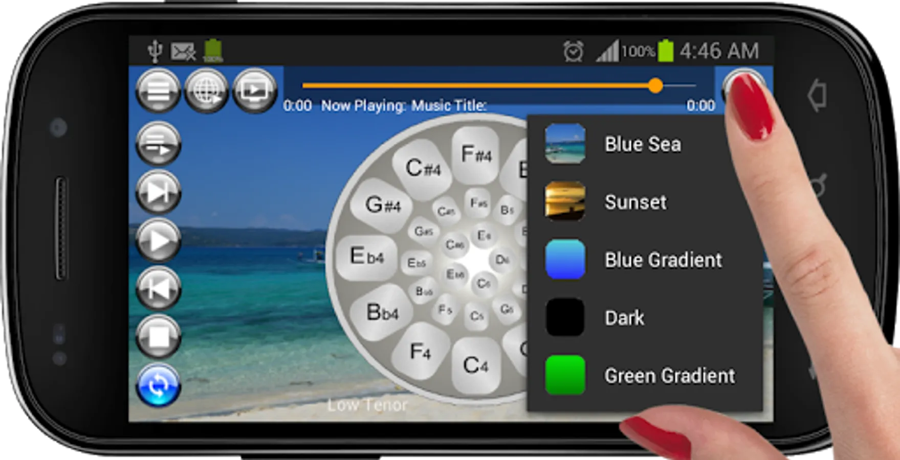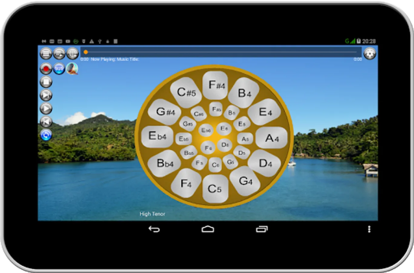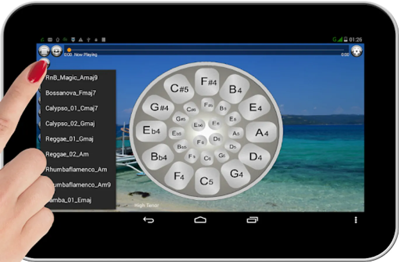 The keys of the steel pan are pressure sensitive on compatible phones which means that hitting the keys lightly produces low-level sounds while hitting the keys hard produces loud sounds. Another important and interesting feature of Steel Drums Musical Instrument app is a music player that is loaded with eleven (11) sampled play along sound loops for jamming or practice playing. There are two playlist buttons; one for tracks that are packaged with the app and one for online streaming. To play the loops, simply long-press either of the two playlist buttons and select a sample from the playlist. The sound loop samples /backing tracks featuring musical styles consisting of bossanova, calypso, reggae, rhumba flamenco, r&b, samba, pop, blues, rock, soul, country, ballad, and dance styles were arranged, performed, and recorded by the developer using built-in musical styles on his own Yamaha PSRS 900 keyboard. More backing tracks and other features will be added during the app's development life cycles to provide users with quality musical performance entertainment.