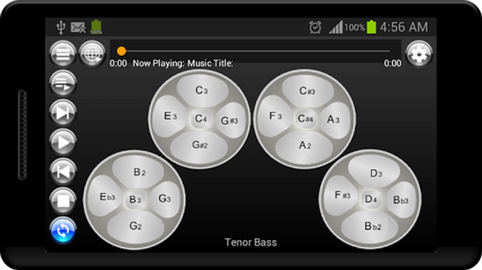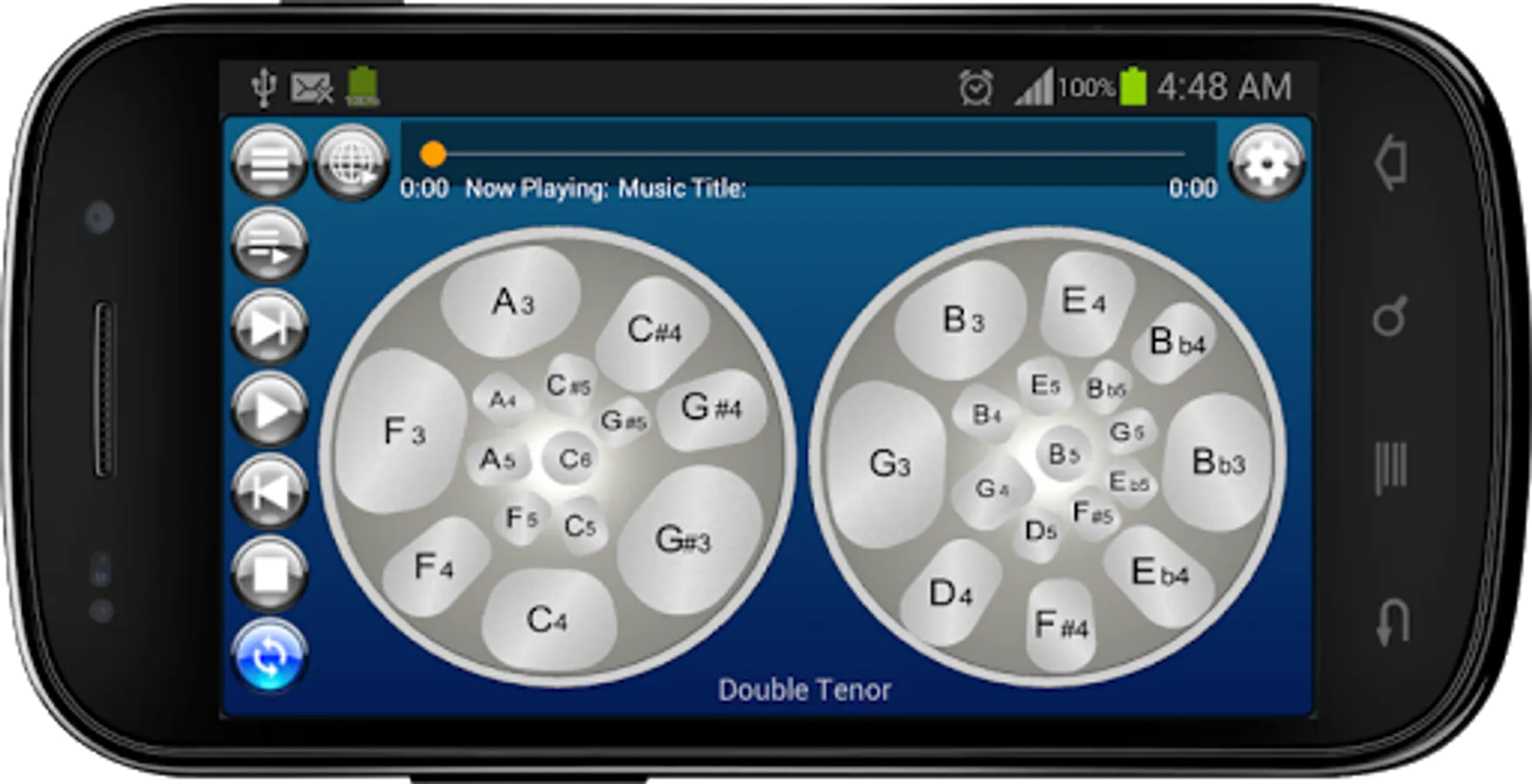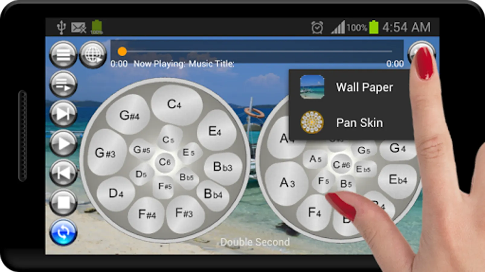 The keys of the steel pan are pressure sensitive on compatible phones which means that hitting the keys lightly produces low-level sounds while hitting the keys hard produces loud sounds. Another important and interesting feature of Steel Drums Musical Instrument app is a music player that is loaded with eleven (11) sampled play along sound loops for jamming or practice playing. There are two playlist buttons; one for tracks that are packaged with the app and one for online streaming. To play the loops, simply long-press either of the two playlist buttons and select a sample from the playlist. The sound loop samples /backing tracks featuring musical styles consisting of bossanova, calypso, reggae, rhumba flamenco, r&b, samba, pop, blues, rock, soul, country, ballad, and dance styles were arranged, performed, and recorded by the developer using built-in musical styles on his own Yamaha PSRS 900 keyboard. More backing tracks and other features will be added during the app's development life cycles to provide users with quality musical performance entertainment.