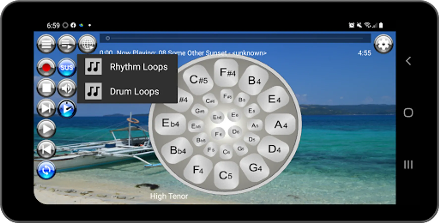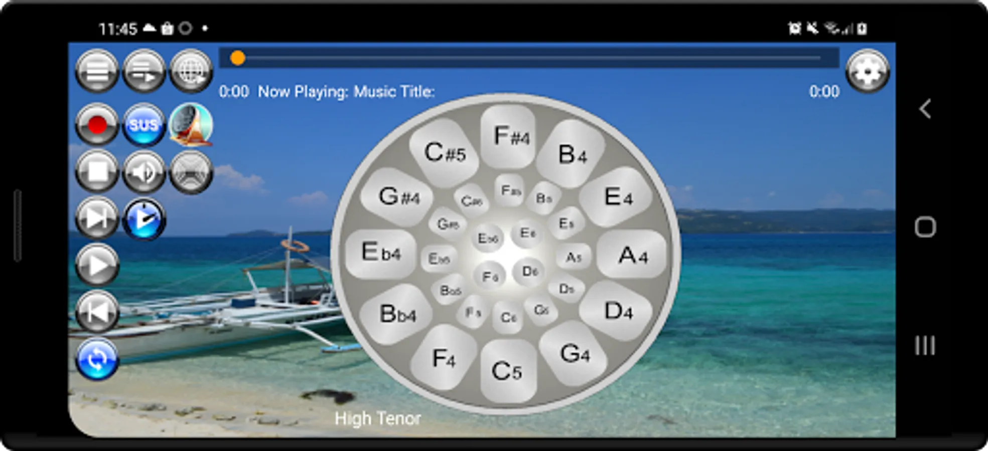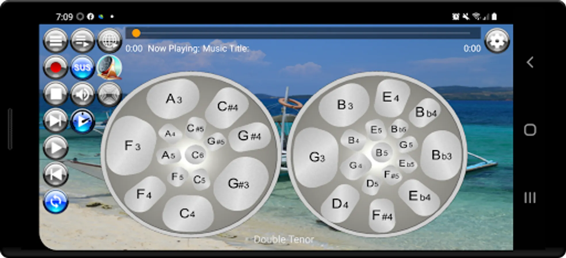 Musical Steel Drums Pro app is packed with a media player that is loaded with eleven (11) sampled play along sound loops for jamming or practice playing. There are two playlist buttons; one for tracks that are packaged with the app and one for online streaming. To play the loops, simply long press either of the two playlist buttons and select a sample from the playlist. The sound loop samples /backing tracks featuring musical styles consisting of bossanova, calypso, reggae, rhumba flamenco, r&b, samba, pop, blues, rock, soul, country, ballad, and dance styles were arranged, performed and recorded by the developer using built-in musical styles on his own Yamaha PSRS 900 keyboard.
