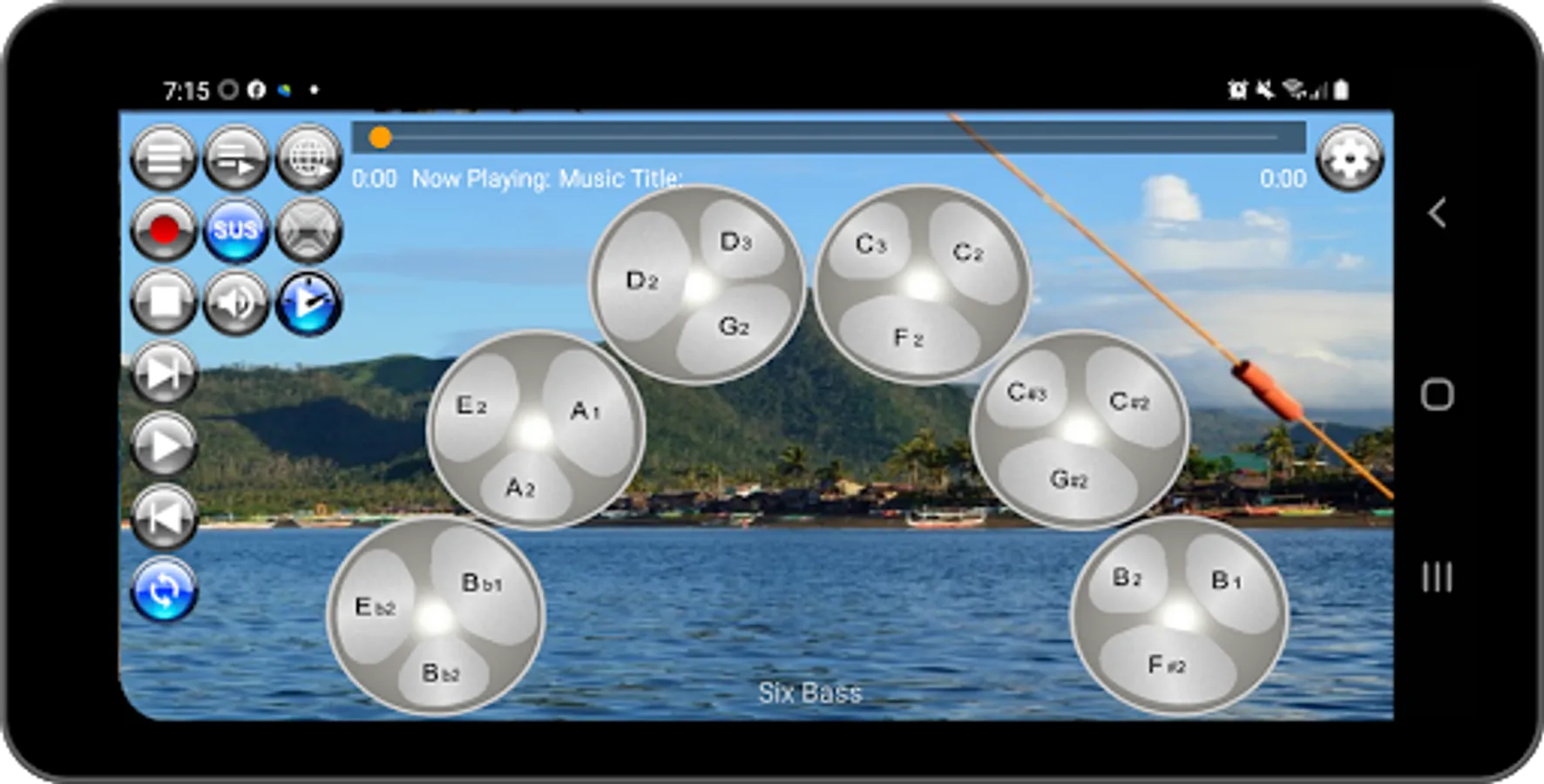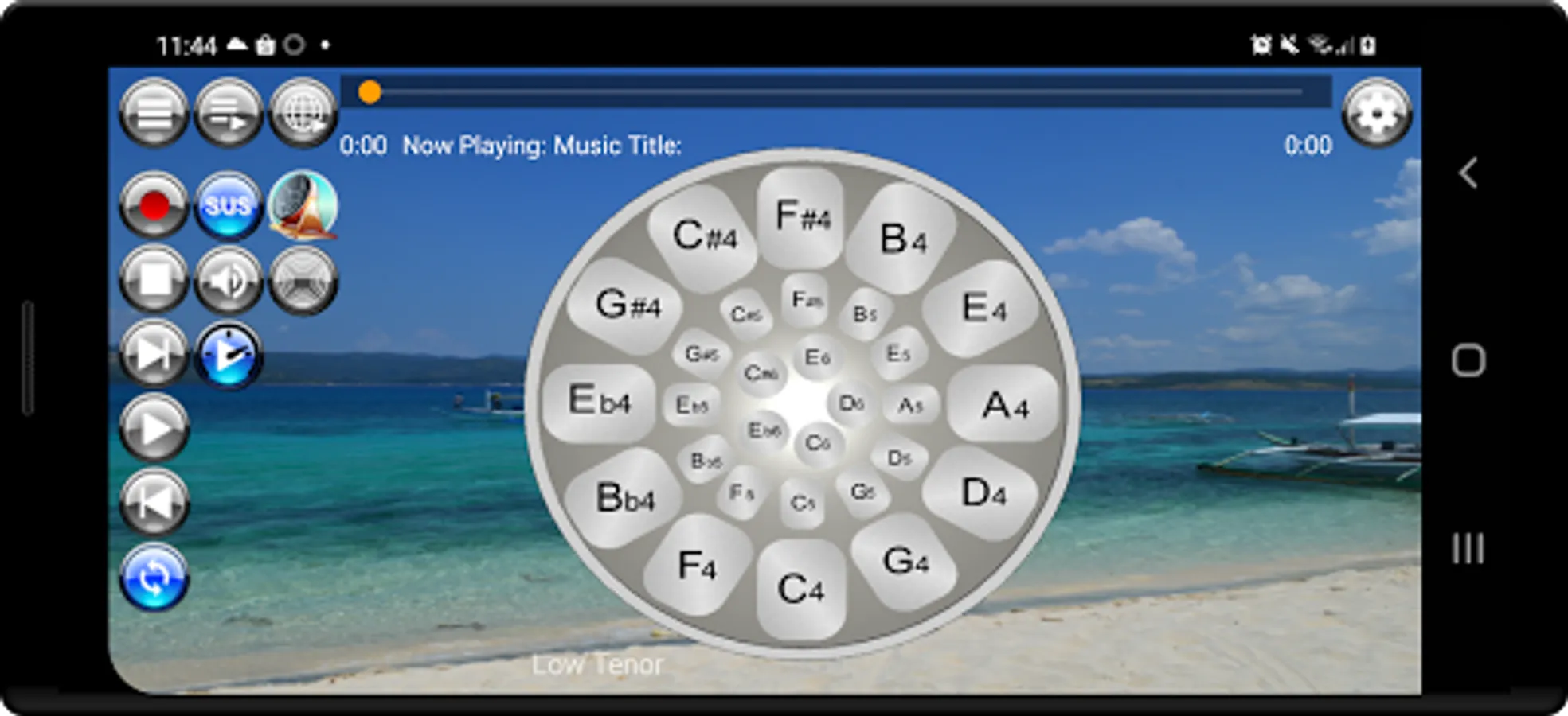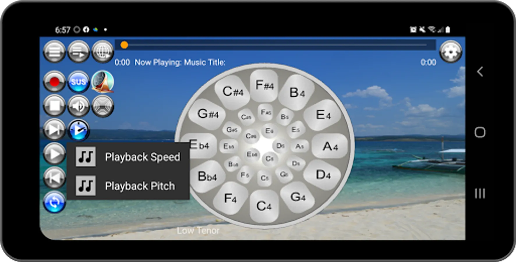 Musical Steel Drums Pro app is packed with a media player that is loaded with eleven (11) sampled play along sound loops for jamming or practice playing. There are two playlist buttons; one for tracks that are packaged with the app and one for online streaming. To play the loops, simply long press either of the two playlist buttons and select a sample from the playlist. The sound loop samples /backing tracks featuring musical styles consisting of bossanova, calypso, reggae, rhumba flamenco, r&b, samba, pop, blues, rock, soul, country, ballad, and dance styles were arranged, performed and recorded by the developer using built-in musical styles on his own Yamaha PSRS 900 keyboard.