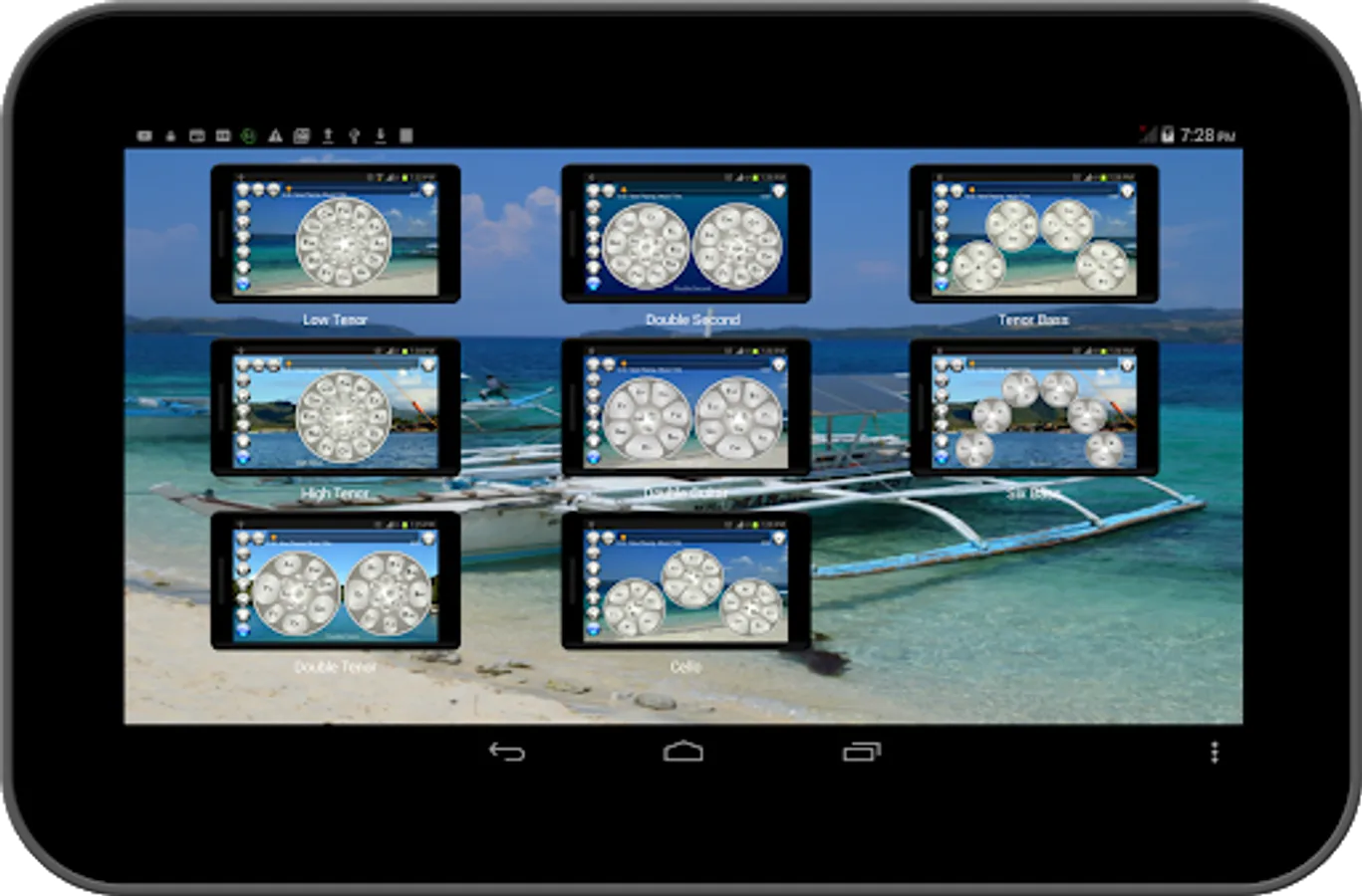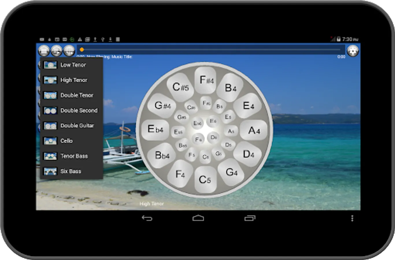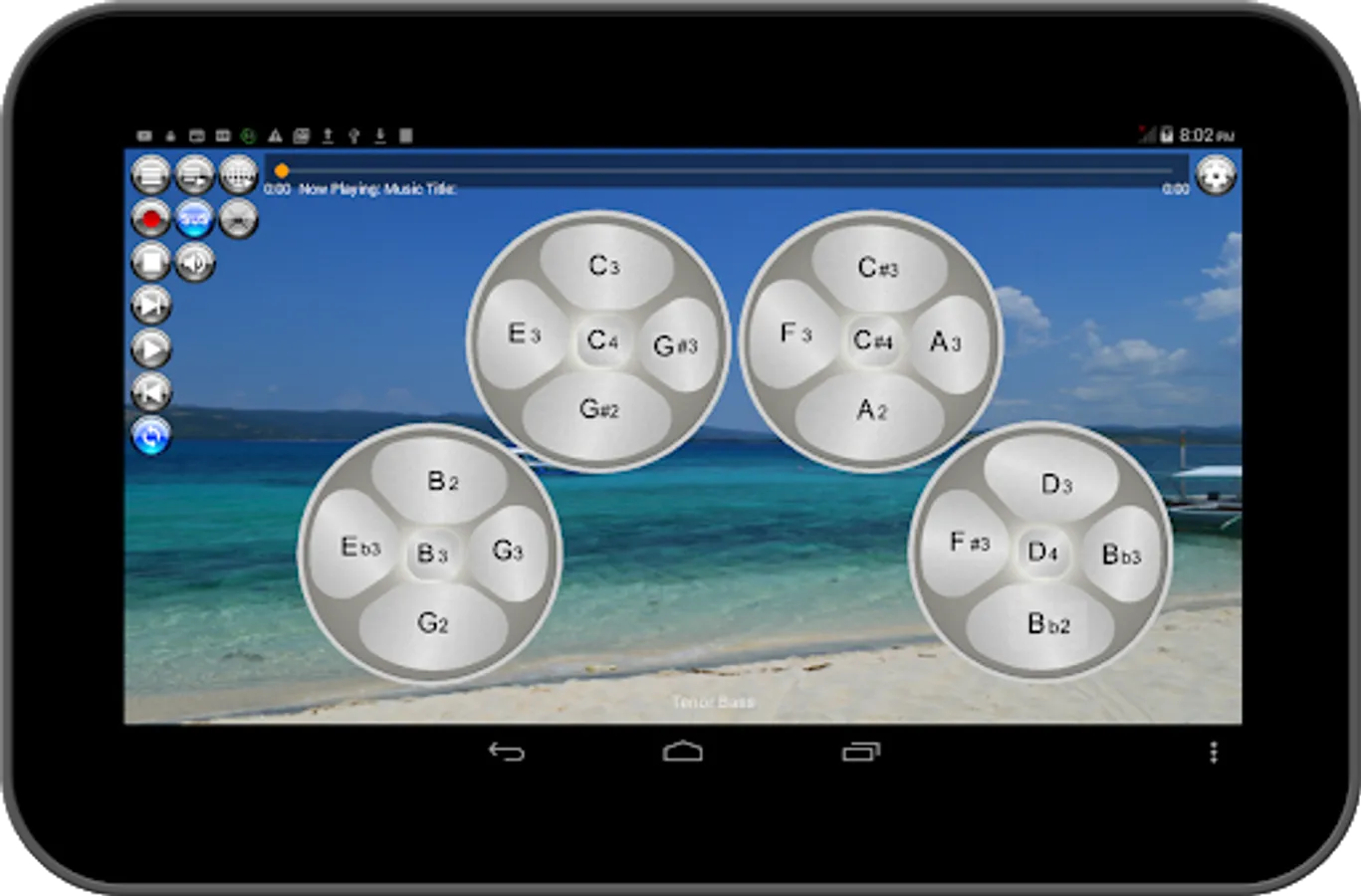 Musical Steel Drums Pro app is the ad free, pay to download version of Musical Steel Drums Free app. It is a virtual instrument of the unusual musical instrument that originated in Trinidad and Tobago and commonly used on Caribbean, Latin, and Afro-Latino/Afro-Cuban jazz music. This steel pan or drum app features eight (8) types of steel drums according to note as follows: Low Tenor or C-Lead Pan, High Tenor Pan, Double Tenor Pans, Double Second Pans, Double Guitar Pans, Cello Pan, Tenor Bass Pans, and Six Bass Pans.
