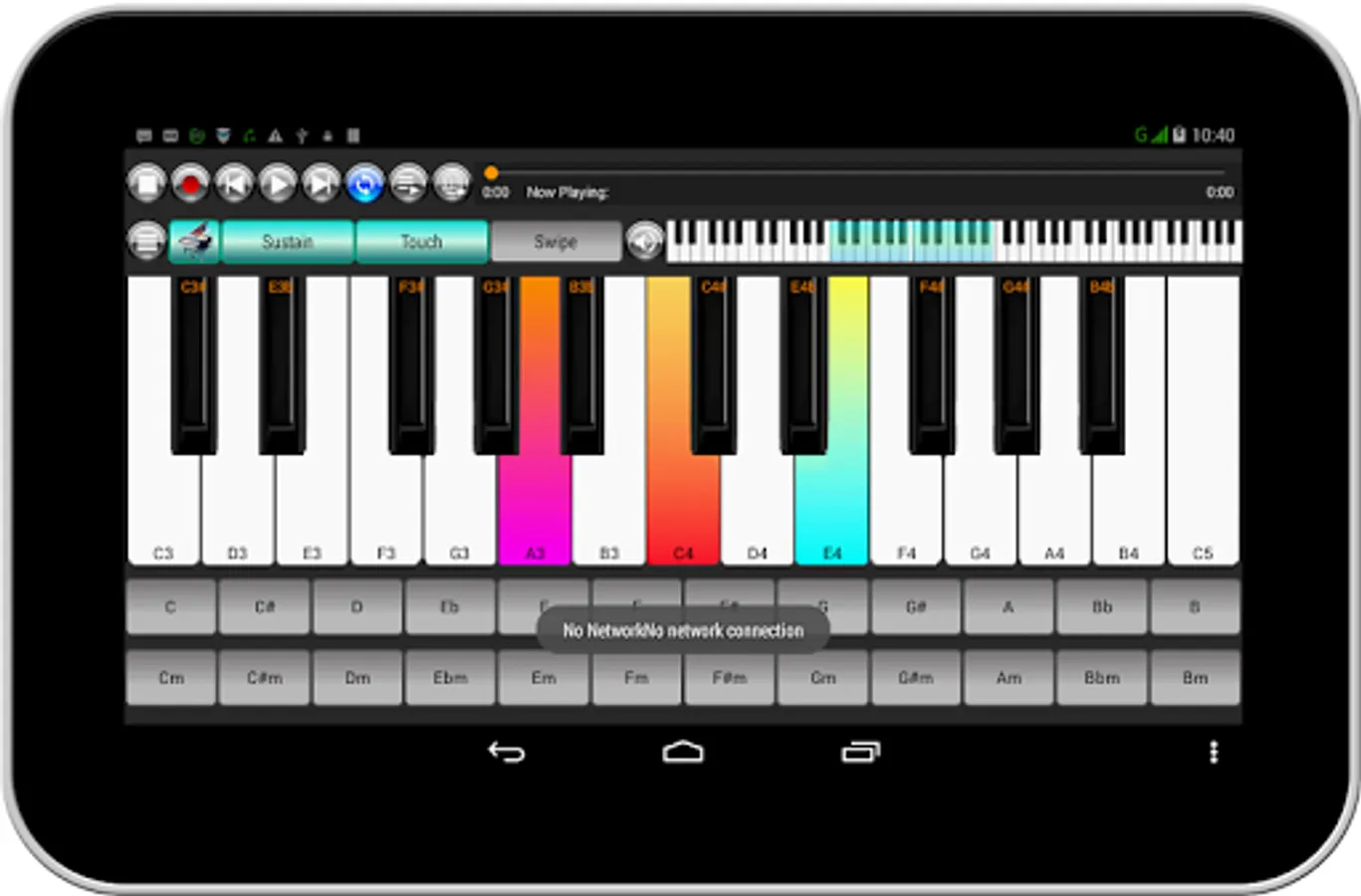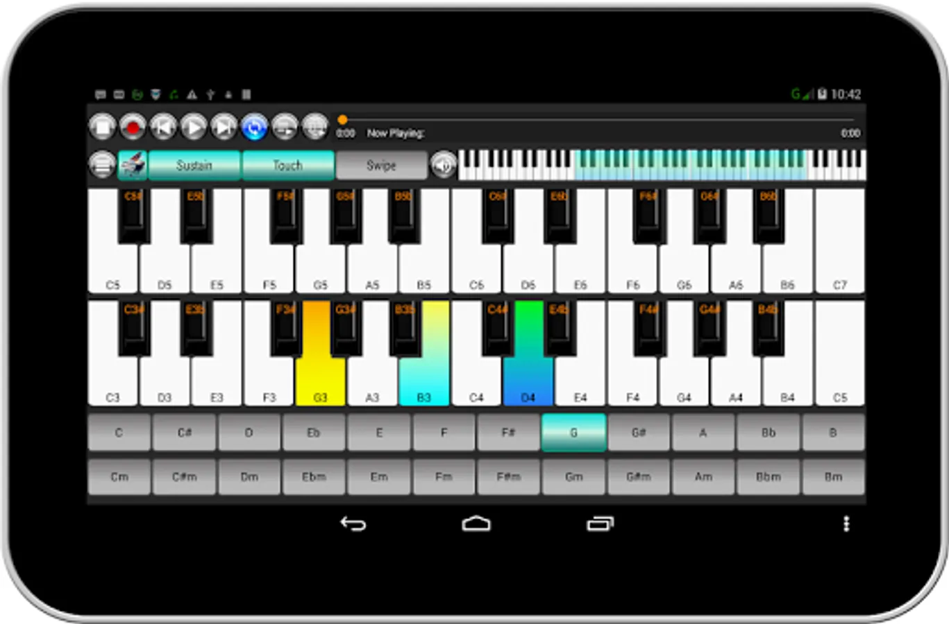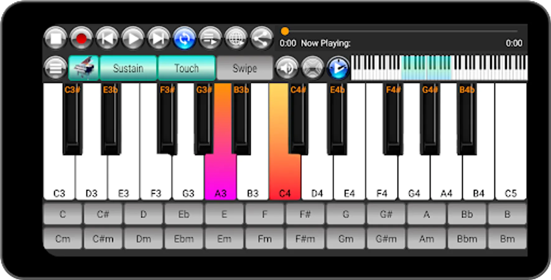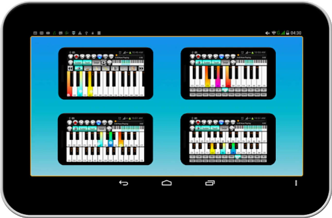 The musical keyboard application features an audio recorder, media player, four keyboard layouts with six (6) octaves and a maximum of ten note polyphony, where users can play ten notes simultaneously. The sounds are generated using audio streams and sound parameters cannot be changed as compared to real synthesizer keyboards. The tuning is preset at 440 kHz standard tuning or ISO 16 and cannot be changed. While it is intended for personal entertainment purposes or as a pocket musical toy, this application can also be used as a reference tool to tune physical instruments, to identify notes while studying unfamiliar tunes. Sustain function and touch response are also supported on compatible devices.