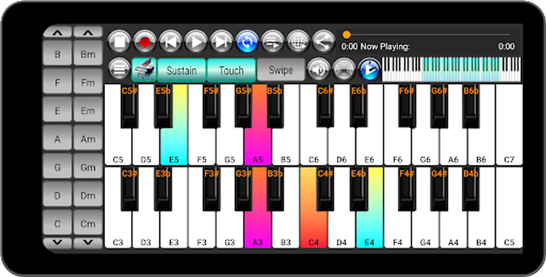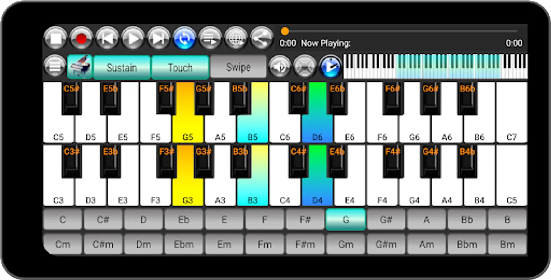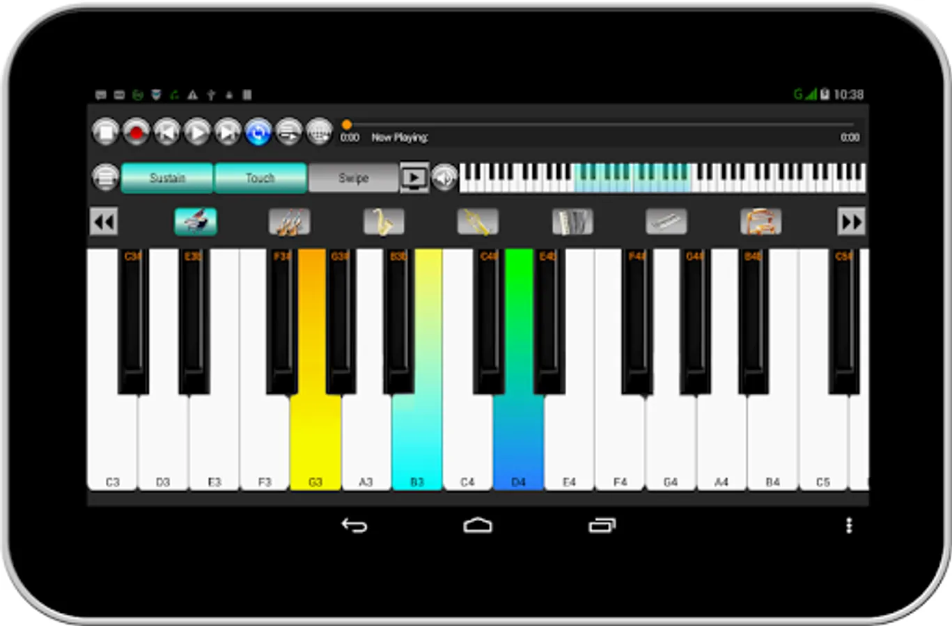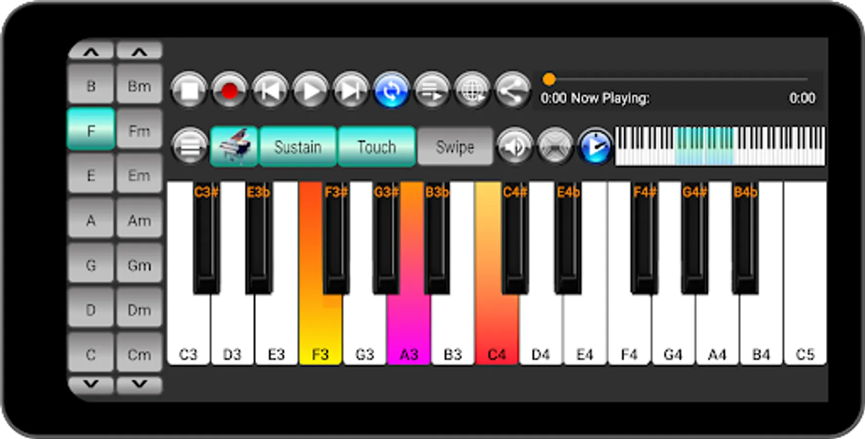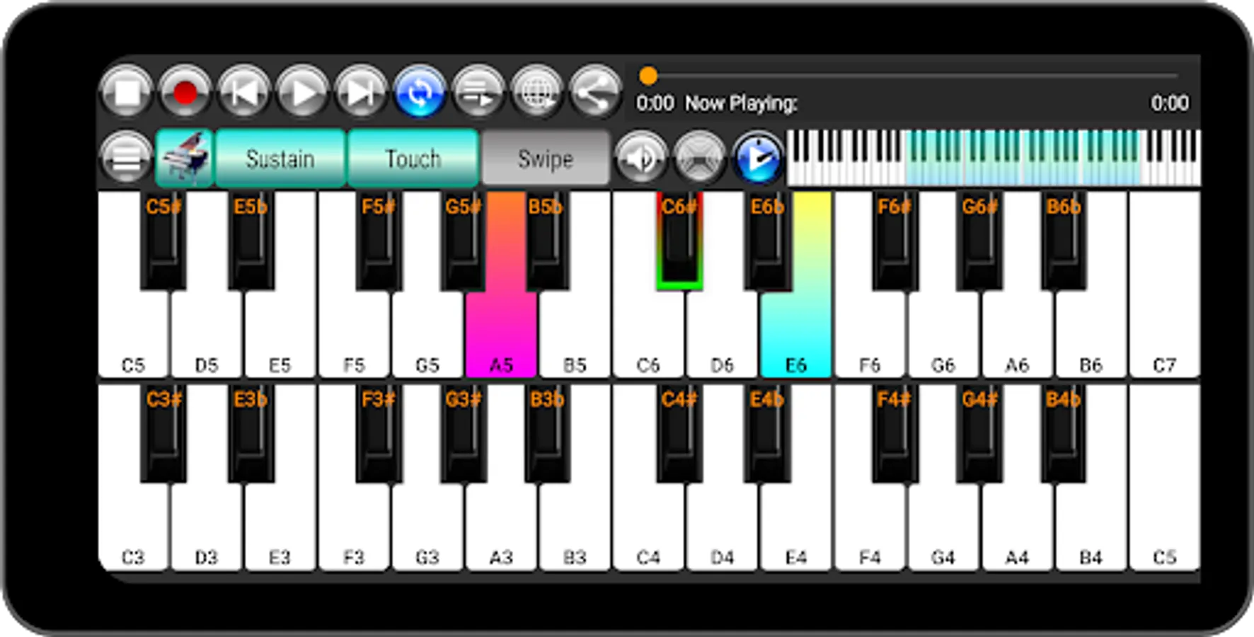 The musical keyboard application features an audio recorder, media player, four keyboard layouts with six (6) octaves and a maximum of ten note polyphony, where users can play ten notes simultaneously. The sounds are generated using audio streams and sound parameters cannot be changed as compared to real synthesizer keyboards. The tuning is preset at 440 kHz standard tuning or ISO 16 and cannot be changed. While it is intended for personal entertainment purposes or as a pocket musical toy, this application can also be used as a reference tool to tune physical instruments, to identify notes while studying unfamiliar tunes. Sustain function and touch response are also supported on compatible devices.