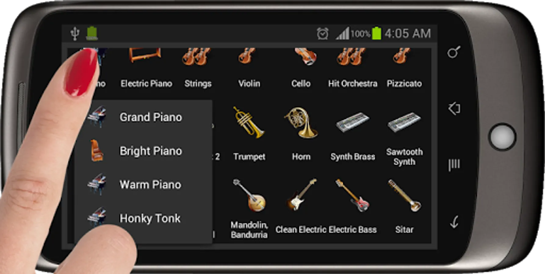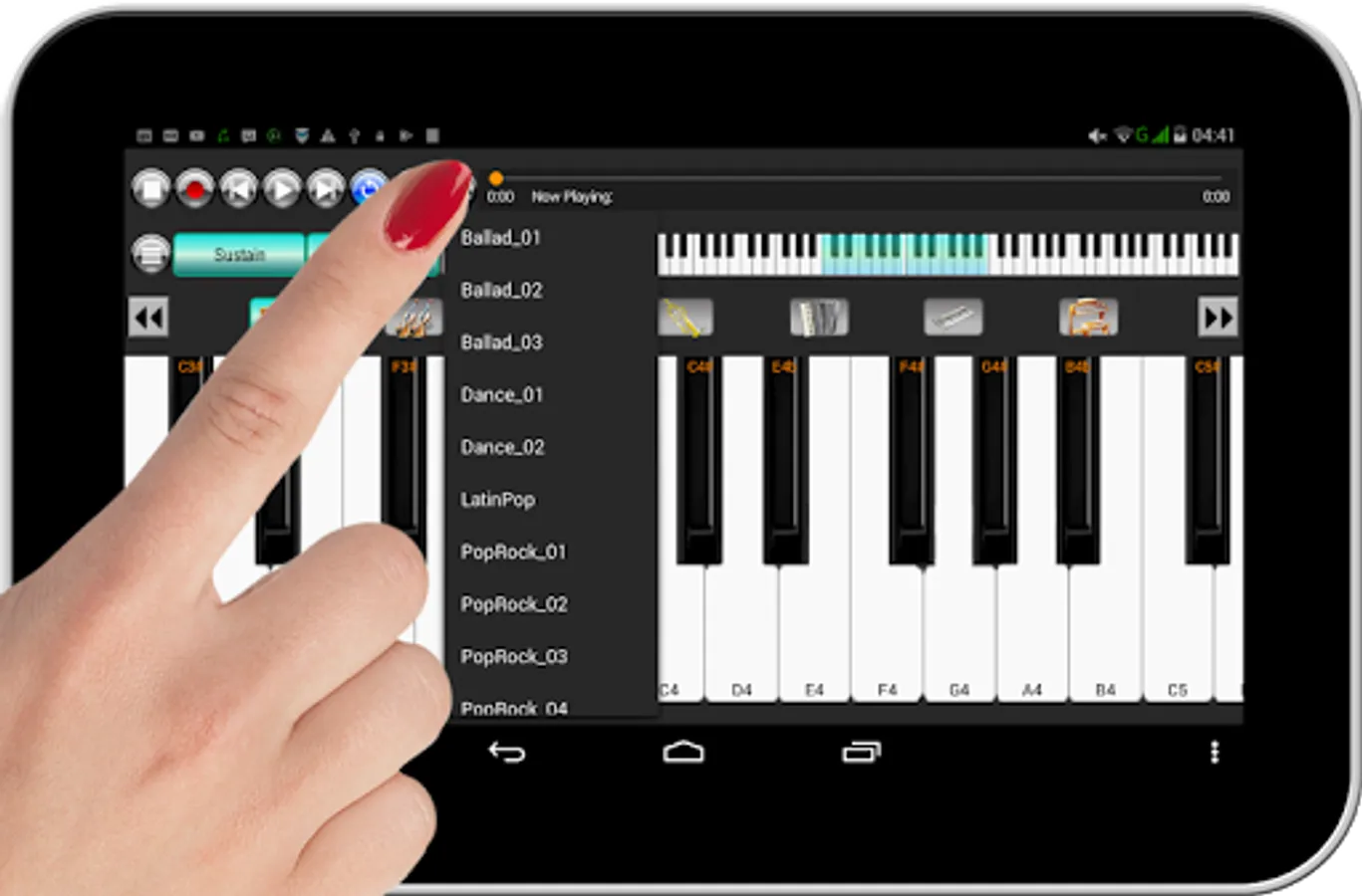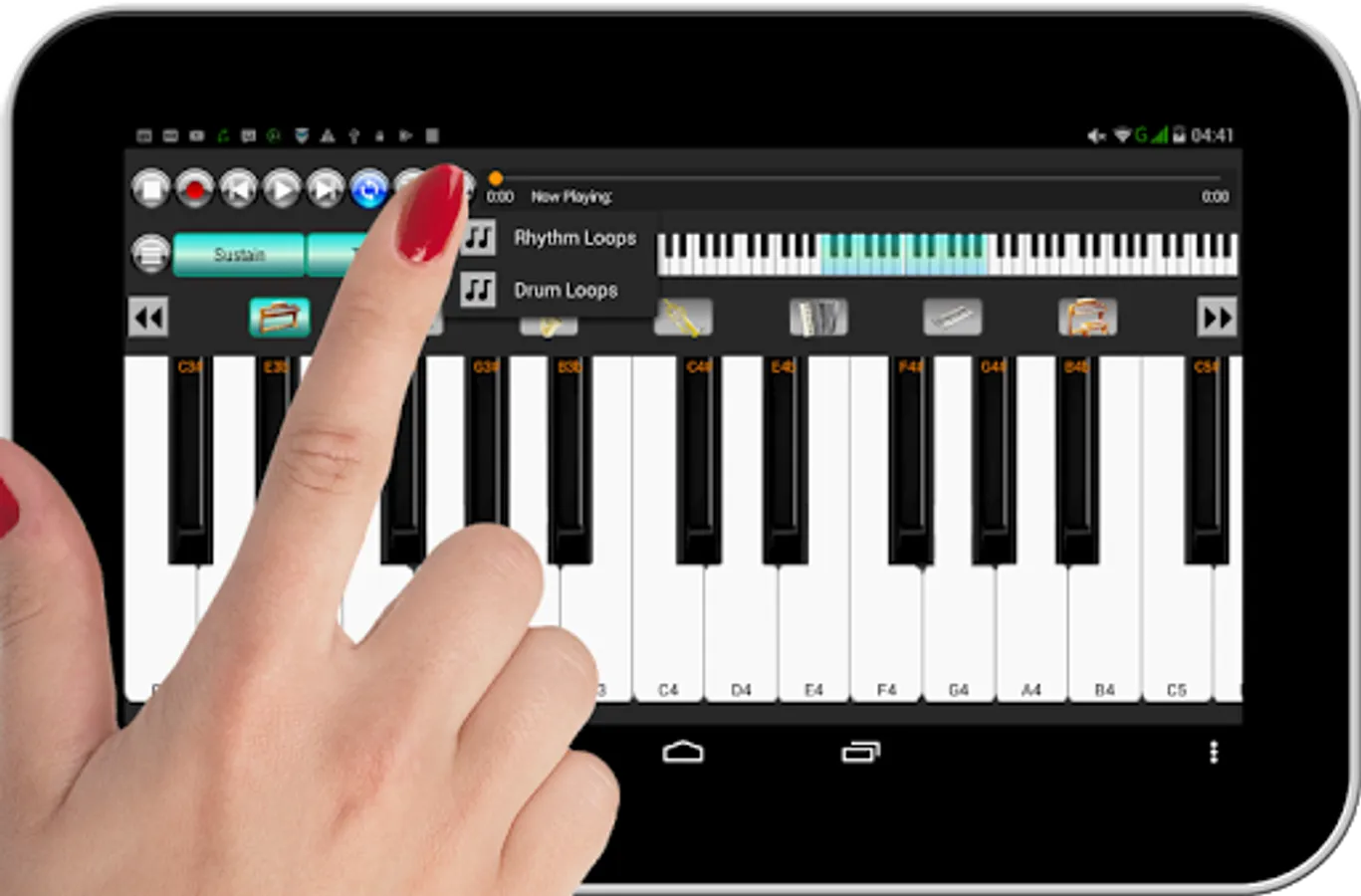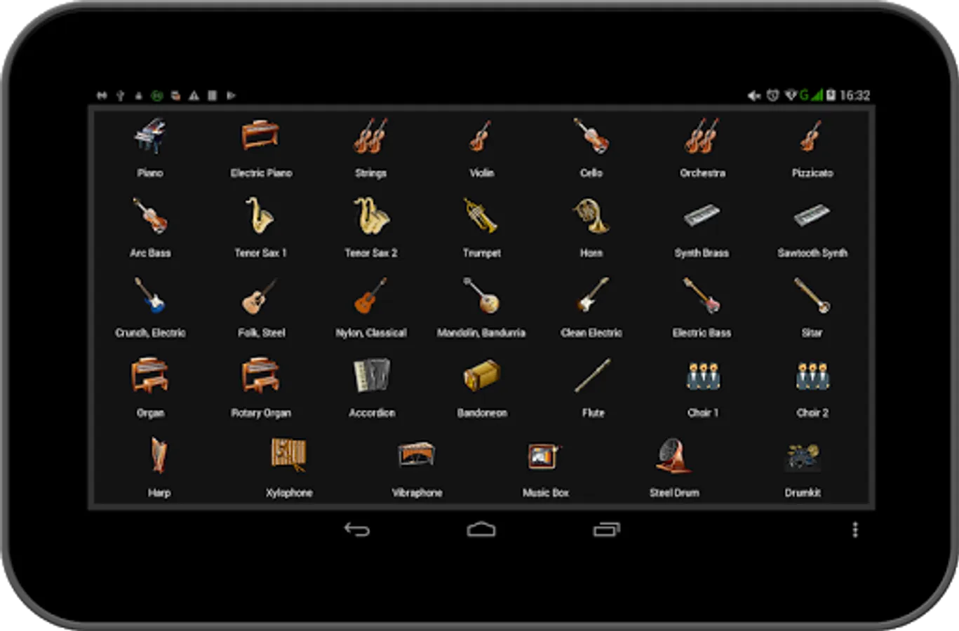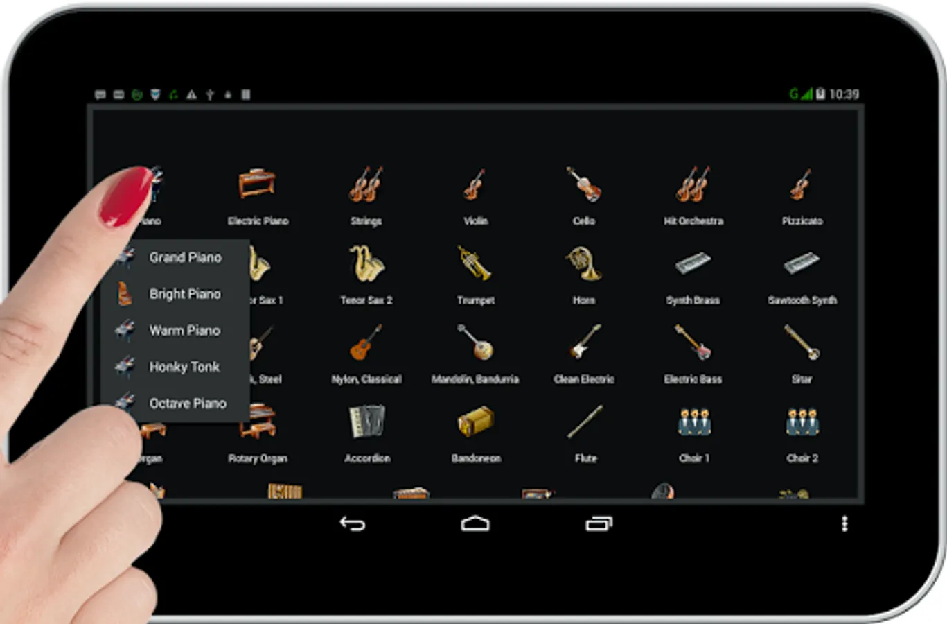 Strings and Piano Keyboard Pro is a simple but responsive Android musical keyboard application that features realistic sounds of forty three instruments consisting of five piano sounds that include grand piano, bright piano, warm piano, honky tonk piano, and octave piano; five electric piano sounds that include electric piano, phase epiano, galaxy epiano, jazz chorus, and vintage epiano; acoustic folk guitar, nylon/classical/spanish guitar, electric guitar-clean sound, electric guitar-crunch distortion, bandurria/mandolin, sitar, tenor sax duet unison, synth brass, sawthooth synth, two choir/human synthesized voices, orchestral strings, violin, cello, pizzicato, orchestra hit, brass, trumpet, sax, flute, organ, accordion, bandoneon, vibraphone, xylophone, steel drums or steel pan, drums and percussion.