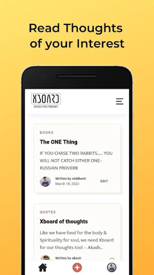 Read what people think! Xboard is an ad-less platform which only contains powerful thoughts of people around you in limited words. No unnecessary suggestions just the deep thoughts on topics that you only care about. If you loved someone's thought don't just keep it in your mind save it on your Xboard as well as you can follow that Author.