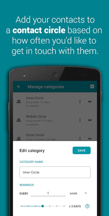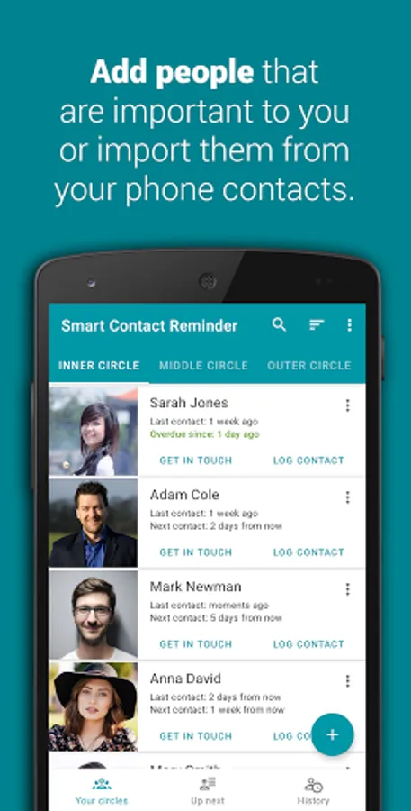Smart Contact Reminder allows you to either add contacts individually or use the batch import feature to add existing contacts from your phonebook. Use predefined categories - which we call circles - to sort your contacts according to the strength of your relationship. Every circle has an adjustable reminder interval.
