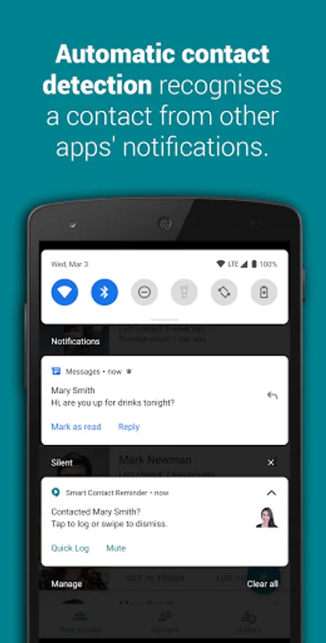 • automatic detection of contact for effortless logging of contacts from other apps;
