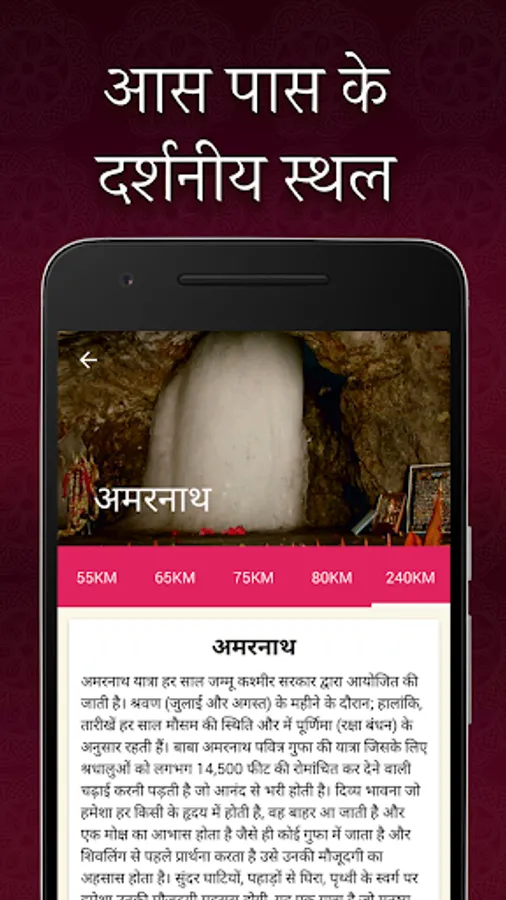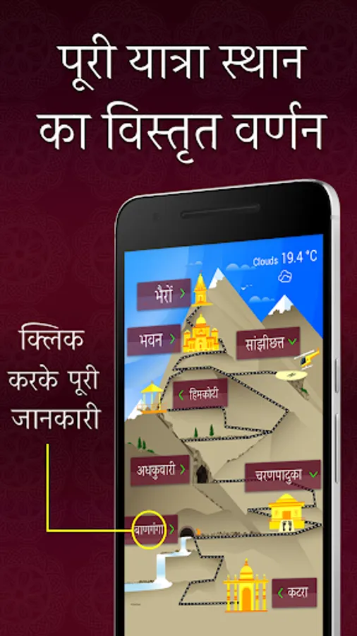Vaishno Devi Aarti Darshan App is free to download. The Vaishno Devi Bhakt App opens with a beautiful map of Vaishno Mata Shrine. It works as an offline app, that means you can take Vaishno Devi App where there is no internet connection. Tapping on locations of the map gives you the detailed history of the place, weather information, emergency contact number, full story of Mata Vaishno Devi Shrine and much more.