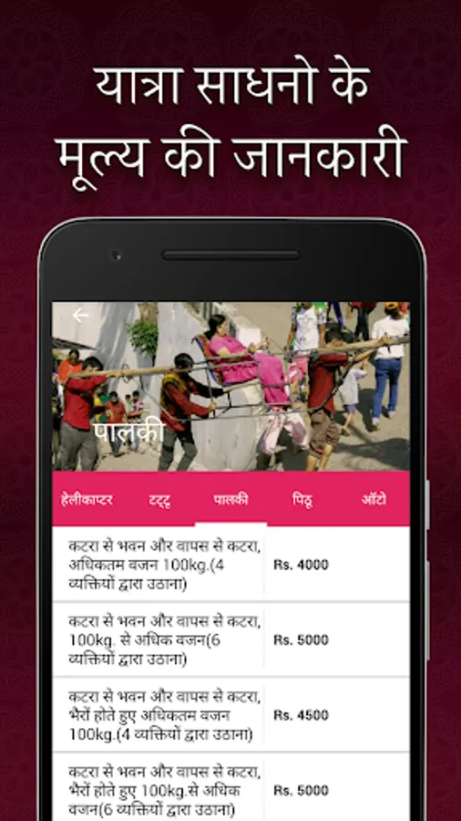 Vaishno Devi Bhakt App also offers you bhajan of Mata Vaishno Devi Shrine. You get reminders of listening bahajan in the morning and in the evening. You can watch selected videos of Mata Vaishno Devi and legends associatd with the shrine. Further, there is information of Helicopter, palki, horse riding rates. You will never get cheated when you carry this information with you. you also get the information of nearby places to visit and much more.