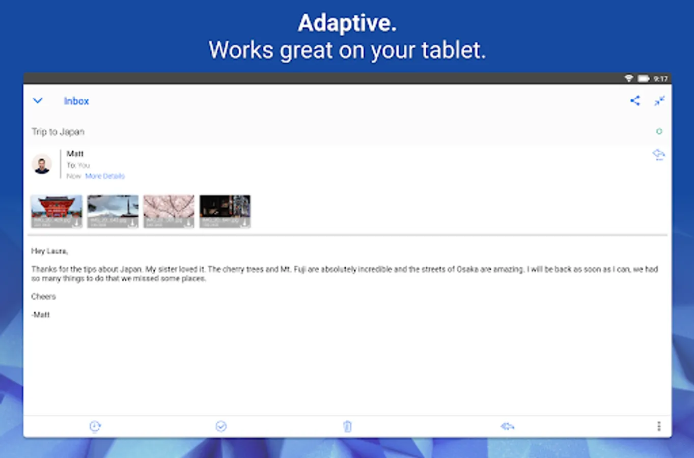 Blue Mail is a free, secure, beautifully designed, universal email app, featuring smart and elegant user experience and capable of managing an unlimited number of mail accounts from various providers. Blue Mail allows for smart push notifications and group emailing while enabling personalization across multiple email accounts. Being ad-free, Blue Mail is the perfect replacement for your stock email app.