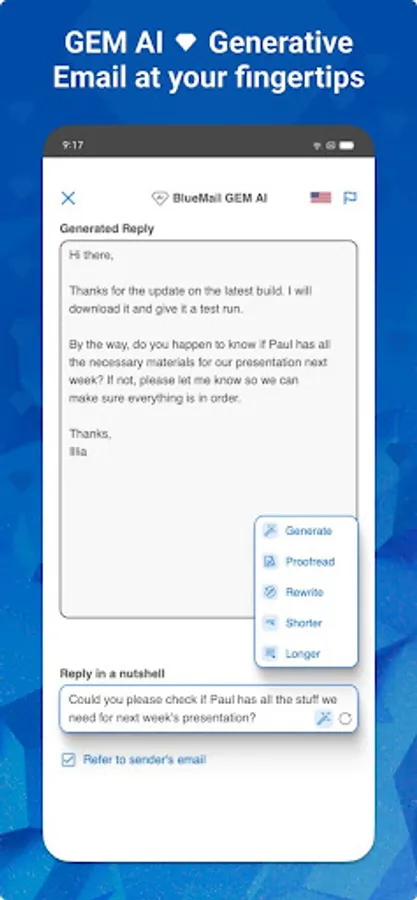 ● BlueMail GEM AI leverages the power of OpenAI ChatGPT to write emails, suggest responses & summarize.
