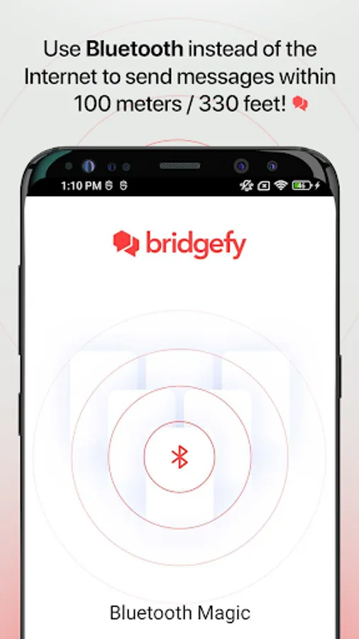 The Bridgefy App lets you send offline messages to friends and family within 330 ft (100 m) when you don't have access to Internet, by simply turning on your Bluetooth antenna. Bridgefy is ideal for traveling, natural disasters, rural communities, music festivals, sports stadiums, and much more.